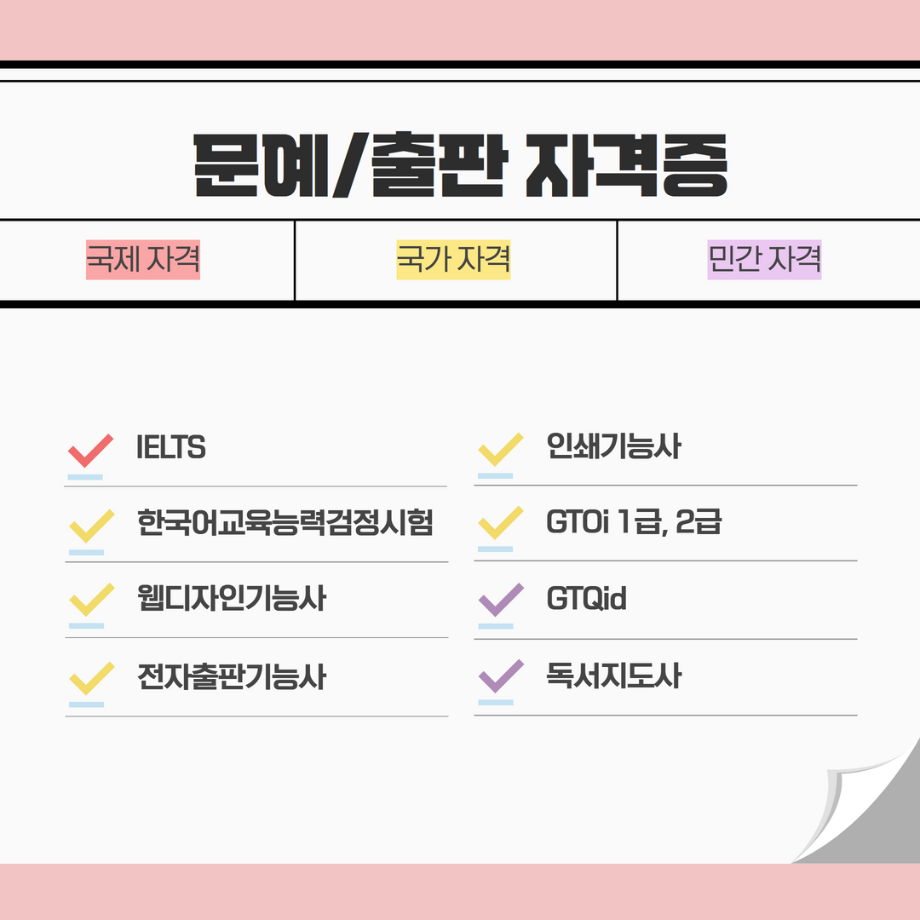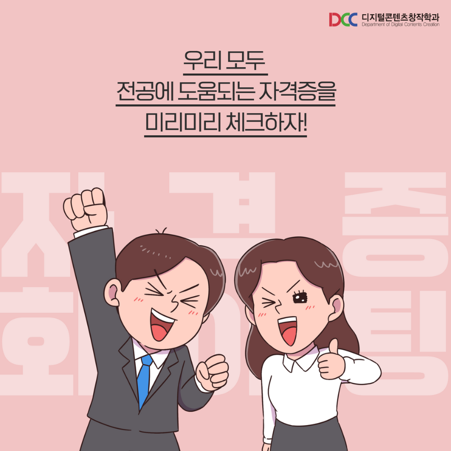 본문 시작 홈으로 MCC News 학과소개 교수소개 학과과정 MCC News MCC SNS 홈페이지가이드 학과 및 재학생 학과 및 재학생 교수 및 졸업생 미디어 정보통 학과 및 재학생 페이스북 트위터 프린트 미리 취득하면 도움 되는 자격증📝 디지털콘텐츠창작학과 5859 2023-04-07 문예,출판 관련 자격증을 알려드립니다! 자격증은 국제/국가/민간으로 나뉘며 총 6개의 자격증이 있습니다! 각 전공에 도움 되는 자격증을 미리 확인하여 취득할 수 있는 기회를 놓치지 마세요! 목록 이전🍭 오늘의 디콘 13탄 🍭 다음 🍭 오늘의 디콘 14탄 🍭 담당부서 : 미디어콘텐츠창작학과 담당자 : - 연락처 : 043-649-1741 최종수정일 : 2024-10-26 만족도조사 만족도 조사 이 페이지에서 제공하는 정보에 대하여 만족하시나요? 매우만족 만족 보통 불만족 매우불만족