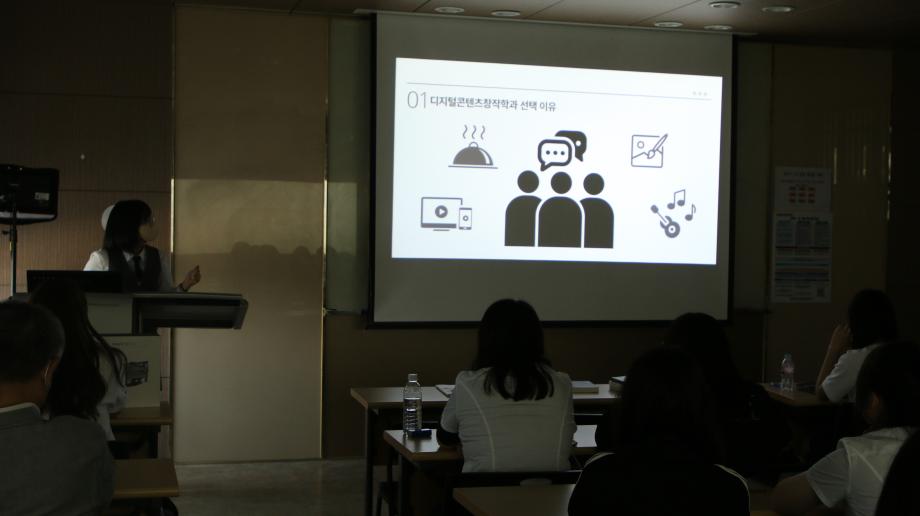 마지막으로 제천여고 학생들의 전공탐색 준비 과정 및 소감을 발표하였는데, 학생들은 “세명대학교 디지털콘텐츠창작학과에 오기 전, 내가 하고 싶은 것, 잘하는 것이 뭔지 구분했고 영상에 관심이 있다는 것을 알게 되었습니다. 전공체험을 한 뒤 영상이 내게 맞는 전공이란 것을 확신할 수 있었습니다. 그래서 의미깊고 가치있는 전공체험이었습니다.” 라고 소감을 발표하였습니다.