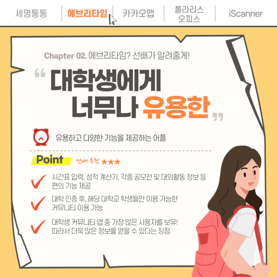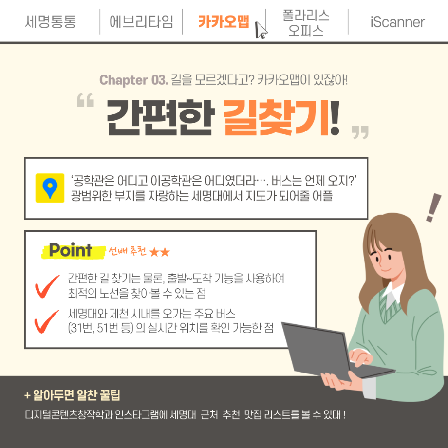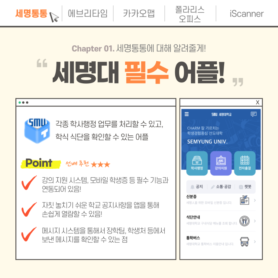 본문 시작 홈으로 MCC News 학과소개 교수소개 학과과정 MCC News MCC SNS 홈페이지가이드 학과 및 재학생 학과 및 재학생 교수 및 졸업생 미디어 정보통 학과 및 재학생 페이스북 트위터 프린트 세명인이라면 알아야 할 꿀팁 앱 디지털콘텐츠창작학과 4178 2023-01-27 세명대 학생이라면 반드시 깔아야 할 앱과 필수는 아니지만 도움이 될 수 있는 앱을 추천합니다! 추천해 드린 앱과 함께 학교생활에 도움이 되었으면 좋겠습니다~ 목록 이전설날 맞이 영화 추천 다음 2023학년도 교외 공모전을 알려드려요 담당부서 : 미디어콘텐츠창작학과 담당자 : - 연락처 : 043-649-1741 최종수정일 : 2024-10-26 만족도조사 만족도 조사 이 페이지에서 제공하는 정보에 대하여 만족하시나요? 매우만족 만족 보통 불만족 매우불만족