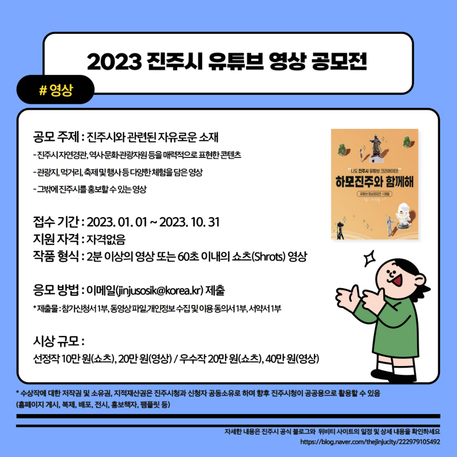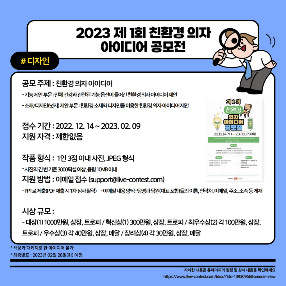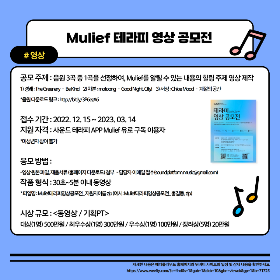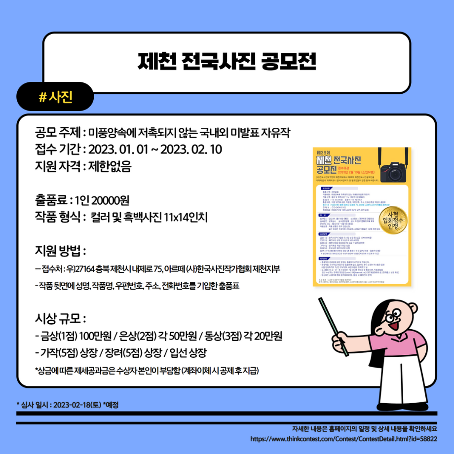 본문 시작 홈으로 MCC News 학과소개 교수소개 학과과정 MCC News MCC SNS 홈페이지가이드 학과 및 재학생 학과 및 재학생 교수 및 졸업생 미디어 정보통 학과 및 재학생 페이스북 트위터 프린트 2023학년도 교외 공모전을 알려드려요 디지털콘텐츠창작학과 4290 2023-02-01 2023학년도 영상, 디자인, 사진 분야의 공모전을 알려드립니다! 겨울방학 동안 다양한 공모전에 참여하며 경험을 쌓는 것은 어떨까요? 목록 이전세명인이라면 알아야 할 꿀팁 앱 다음 23학번 신입생들을 위한 디콘창 Q&A❓ 담당부서 : 미디어콘텐츠창작학과 담당자 : - 연락처 : 043-649-1741 최종수정일 : 2024-10-26 만족도조사 만족도 조사 이 페이지에서 제공하는 정보에 대하여 만족하시나요? 매우만족 만족 보통 불만족 매우불만족