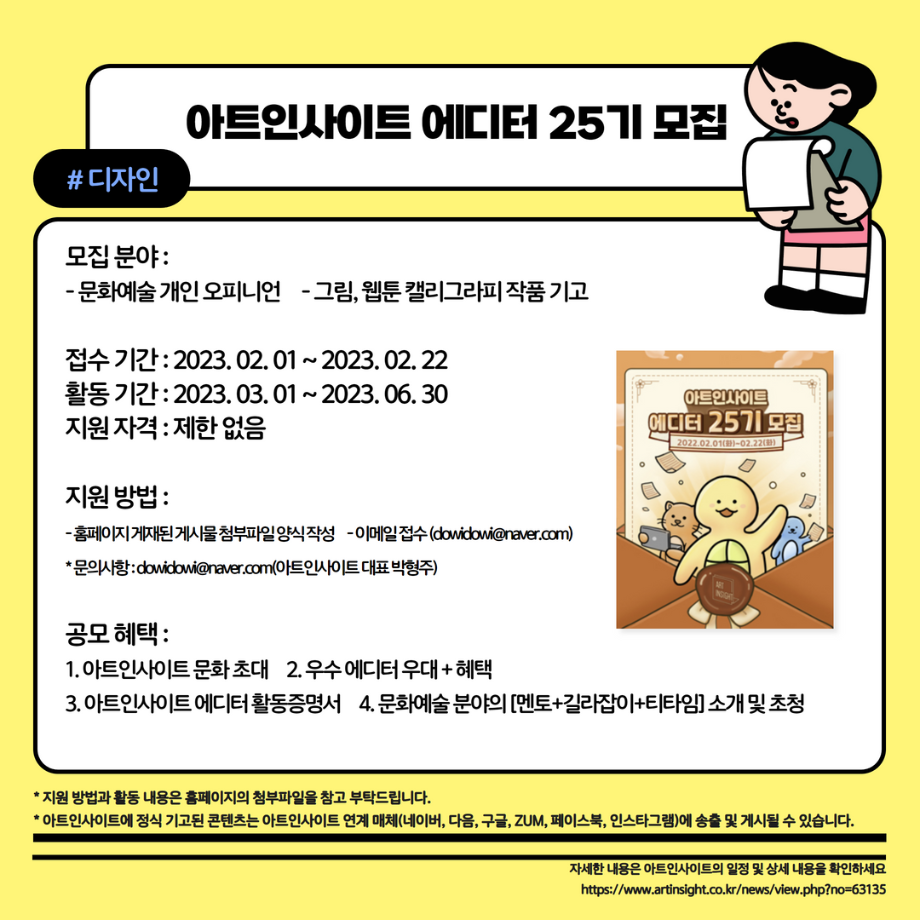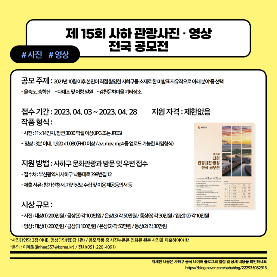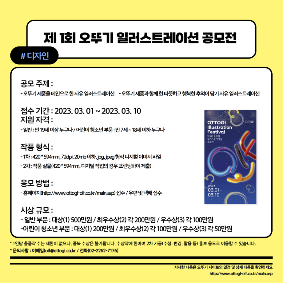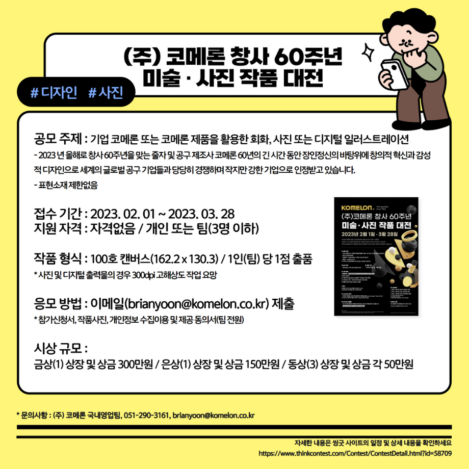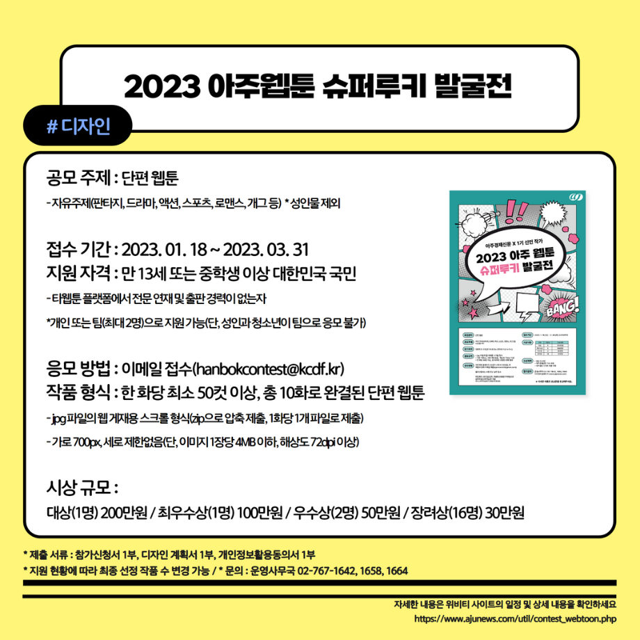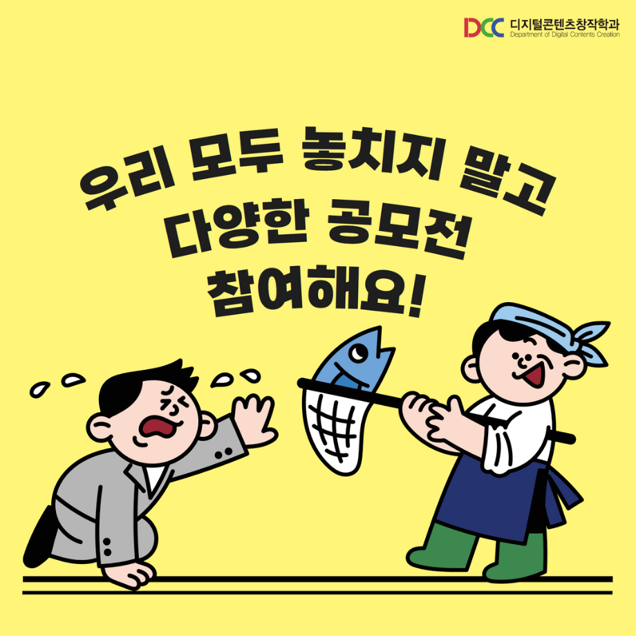 본문 시작 홈으로 MCC News 학과소개 교수소개 학과과정 MCC News MCC SNS 홈페이지가이드 학과 및 재학생 학과 및 재학생 교수 및 졸업생 미디어 정보통 학과 및 재학생 페이스북 트위터 프린트 2023학년도 교외 공모전 알려드려요! 2탄 디지털콘텐츠창작학과 3802 2023-02-14 !2023학년도 영상, 디자인, 사진 분야의 공모전을 알려드립니다! 얼마 남지 않은 겨울방학 공모전에 참여하면서 경험과 실력을 쌓을 수 있는 기회를 놓치지 마세요! 목록 이전23학번 신입생들을 위한 디콘창 Q&A❓ 다음 🍭 오늘의 디콘 12탄 🍭 담당부서 : 미디어콘텐츠창작학과 담당자 : - 연락처 : 043-649-1741 최종수정일 : 2024-10-26 만족도조사 만족도 조사 이 페이지에서 제공하는 정보에 대하여 만족하시나요? 매우만족 만족 보통 불만족 매우불만족