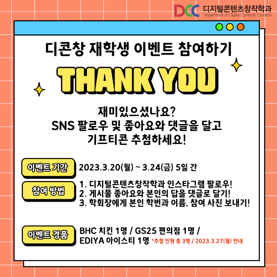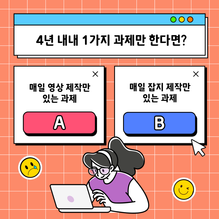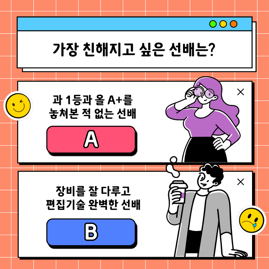 본문 시작 홈으로 MCC News 학과소개 교수소개 학과과정 MCC News MCC SNS 홈페이지가이드 학과 및 재학생 학과 및 재학생 교수 및 졸업생 미디어 정보통 학과 및 재학생 페이스북 트위터 프린트 ✨디콘창 밸런스 게임✨ 디지털콘텐츠창작학과 4740 2023-03-20 디지털콘텐츠창작학과 밸런스 게임을 준비했습니다! 여러분의 선택을 댓글로 알려주세요! 디콘창 재학생 이벤트로 진행하고 있으니 많은 참여 부탁드립니다! ❗이벤트 참여 방법❗ 1. 디지털콘텐츠창작학과 인스타그램 팔로우 2. 게시물 좋아요와 본인의 답을 댓글로 달기 3. 학회장에게 본인 학번과 이름, 참여 사진 보내기 목록 이전미리 취득하면 도움 되는 자격증📝 다음 🍭 오늘의 디콘 13탄 🍭 담당부서 : 미디어콘텐츠창작학과 담당자 : - 연락처 : 043-649-1741 최종수정일 : 2024-10-26 만족도조사 만족도 조사 이 페이지에서 제공하는 정보에 대하여 만족하시나요? 매우만족 만족 보통 불만족 매우불만족