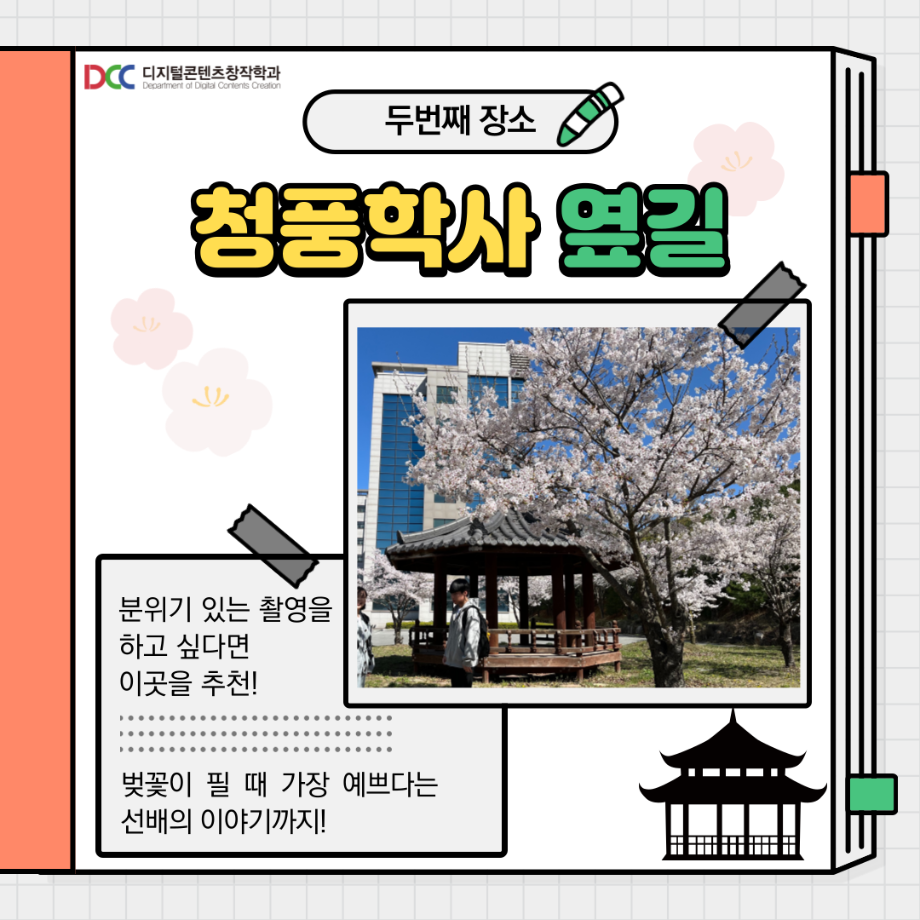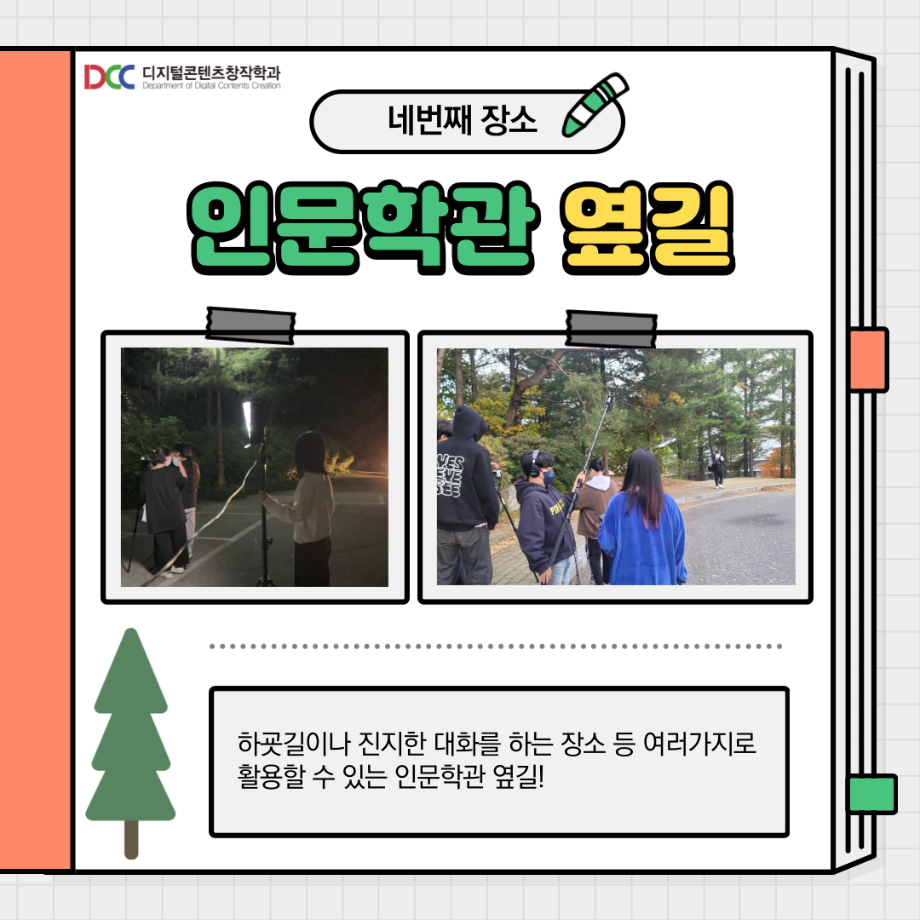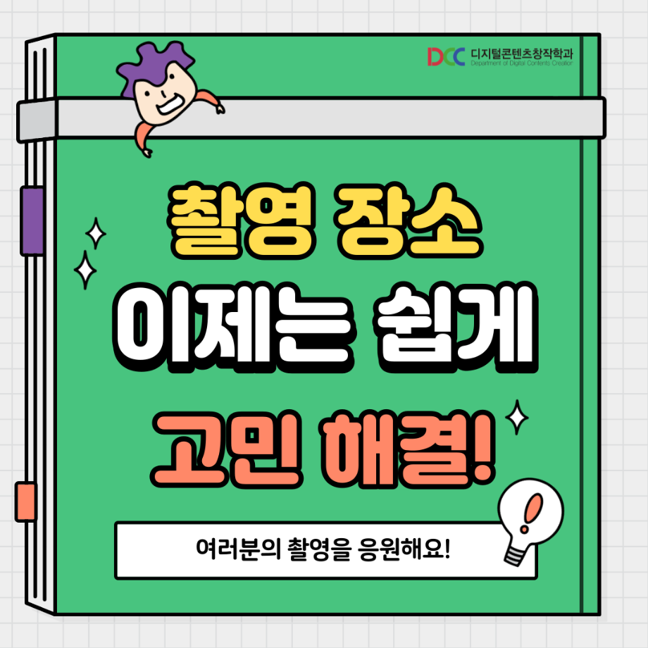 본문 시작 홈으로 MCC News 학과소개 교수소개 학과과정 MCC News MCC SNS 홈페이지가이드 학과 및 재학생 학과 및 재학생 교수 및 졸업생 미디어 정보통 학과 및 재학생 페이스북 트위터 프린트 교내 촬영 장소 추천! 디지털콘텐츠창작학과 4549 2023-08-18 촬영을 해야 하는데 장소가 고민인 디콘창 학생들을 위해 준비했습니다! 학교 안에서의 촬영 장소를 추천해 드려요! 개강이 얼마 남지 않은 만큼 참고하시면 좋을 것 같습니다! 목록 이전🍭 오늘의 디콘 20탄 🍭 다음 📚디콘창 세부전공 소개📚 담당부서 : 미디어콘텐츠창작학과 담당자 : - 연락처 : 043-649-1741 최종수정일 : 2024-10-26 만족도조사 만족도 조사 이 페이지에서 제공하는 정보에 대하여 만족하시나요? 매우만족 만족 보통 불만족 매우불만족