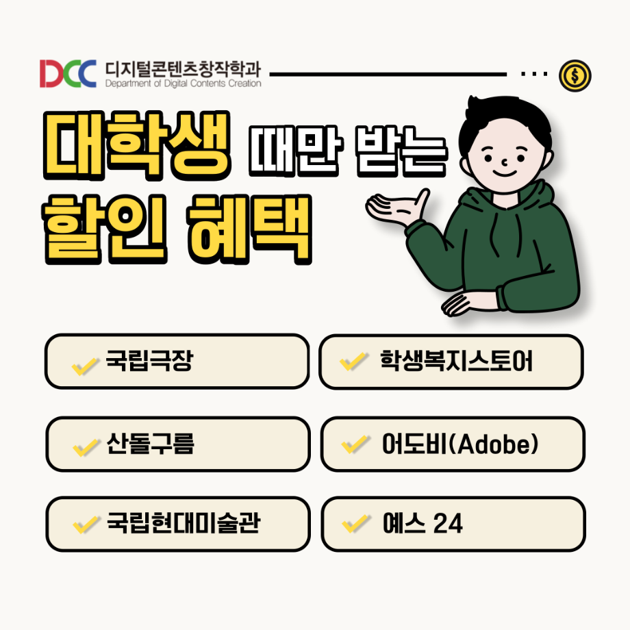 본문 시작 홈으로 MCC News 학과소개 교수소개 학과과정 MCC News MCC SNS 홈페이지가이드 학과 및 재학생 학과 및 재학생 교수 및 졸업생 미디어 정보통 학과 및 재학생 페이스북 트위터 프린트 학생회가 알려주는 재학생 할인 혜택 디지털콘텐츠창작학과 8296 2023-10-16 대학생 때만 받을 수 있는 할인 혜택이 있다고?! 학생회가 정리해서 알려드려요!! 목록 이전🍭 오늘의 디콘 21탄 🍭 다음 장학금 받는 꿀팁🎓 담당부서 : 미디어콘텐츠창작학과 담당자 : - 연락처 : 043-649-1741 최종수정일 : 2024-10-26 만족도조사 만족도 조사 이 페이지에서 제공하는 정보에 대하여 만족하시나요? 매우만족 만족 보통 불만족 매우불만족