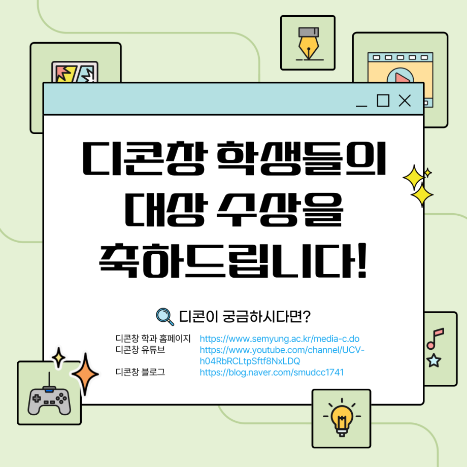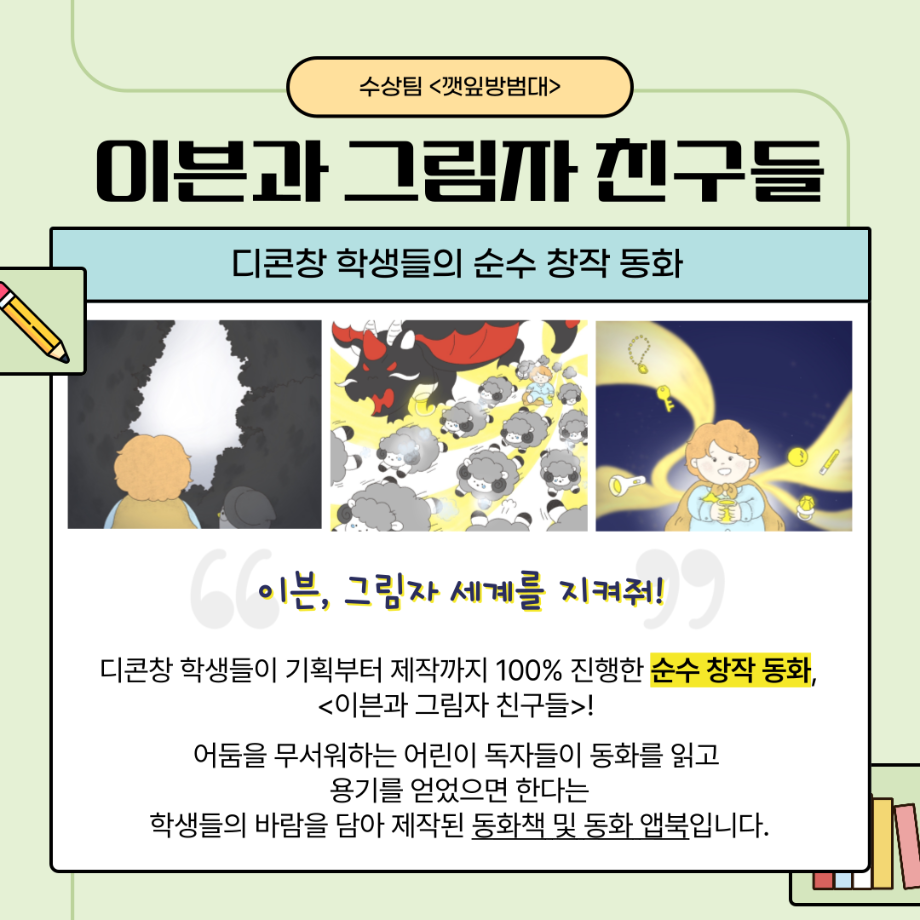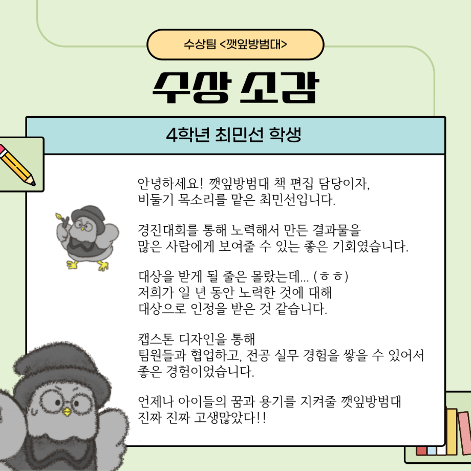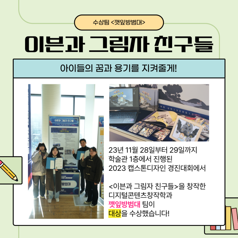 본문 시작 홈으로 MCC News 학과소개 교수소개 학과과정 MCC News MCC SNS 홈페이지가이드 학과 및 재학생 학과 및 재학생 교수 및 졸업생 미디어 정보통 학과 및 재학생 페이스북 트위터 프린트 “이븐과 그림자 친구들”팀이 2023 캡스톤디자인 경진대회에서 대상을 수상하였습니다🎊 디지털콘텐츠창작학과 2553 2023-12-14 이븐과 그림자 친구들에 대한 이야기가 담겨져 있으니 많은 관심 부탁드립니다!! 수상 축하드려요~!! 목록 이전디지털콘텐츠창작학과, 방송 콘텐츠 제작 전문가 특강 및 실습 진행 다음 2023학년도 <커뮤니케이션 통> e-Book 발간! 담당부서 : 미디어콘텐츠창작학과 담당자 : - 연락처 : 043-649-1741 최종수정일 : 2024-10-26 만족도조사 만족도 조사 이 페이지에서 제공하는 정보에 대하여 만족하시나요? 매우만족 만족 보통 불만족 매우불만족