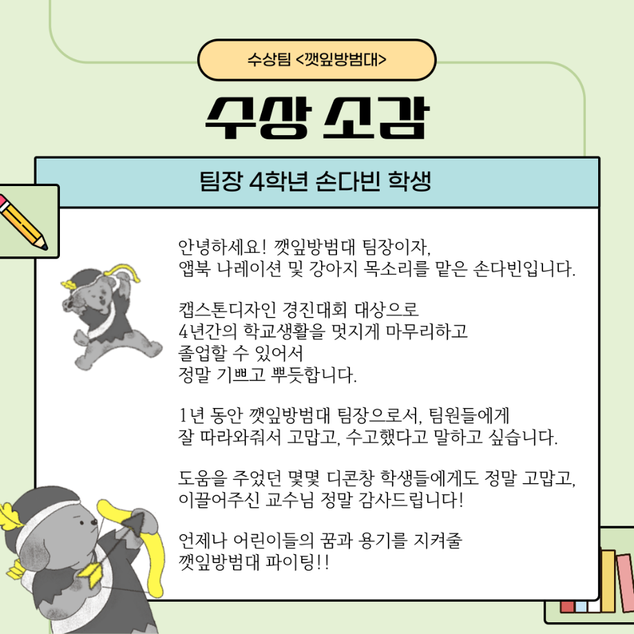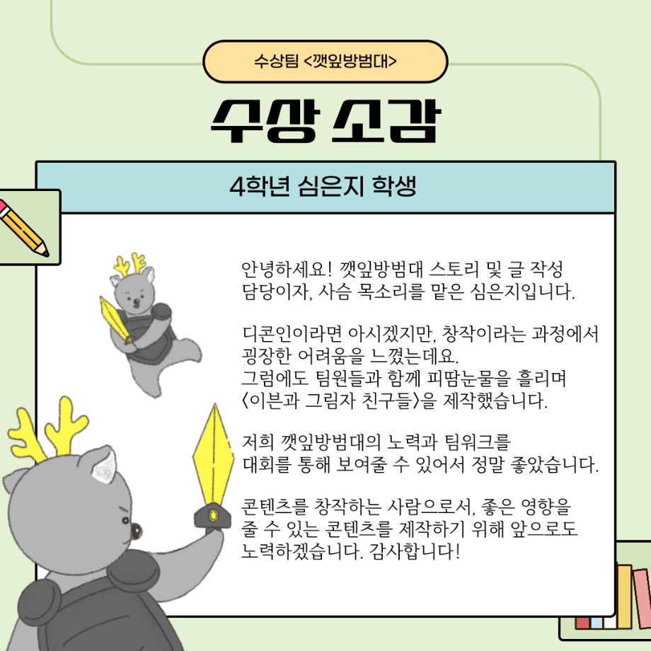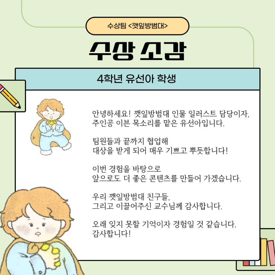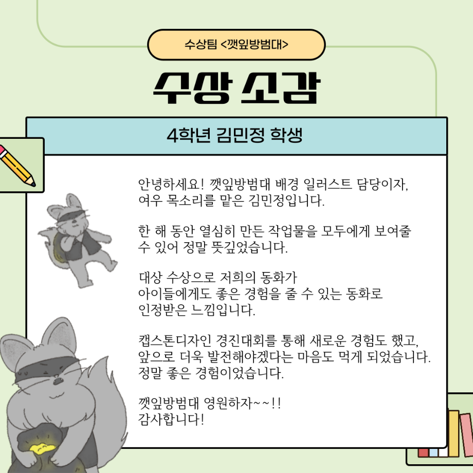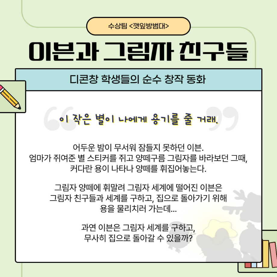 본문 시작 홈으로 MCC News 학과소개 교수소개 학과과정 MCC News MCC SNS 홈페이지가이드 학과 및 재학생 학과 및 재학생 교수 및 졸업생 미디어 정보통 학과 및 재학생 페이스북 트위터 프린트 “이븐과 그림자 친구들”팀이 2023 캡스톤디자인 경진대회에서 대상을 수상하였습니다🎊 디지털콘텐츠창작학과 2553 2023-12-14 이븐과 그림자 친구들에 대한 이야기가 담겨져 있으니 많은 관심 부탁드립니다!! 수상 축하드려요~!! 목록 이전디지털콘텐츠창작학과, 방송 콘텐츠 제작 전문가 특강 및 실습 진행 다음 2023학년도 <커뮤니케이션 통> e-Book 발간! 담당부서 : 미디어콘텐츠창작학과 담당자 : - 연락처 : 043-649-1741 최종수정일 : 2024-10-26 만족도조사 만족도 조사 이 페이지에서 제공하는 정보에 대하여 만족하시나요? 매우만족 만족 보통 불만족 매우불만족