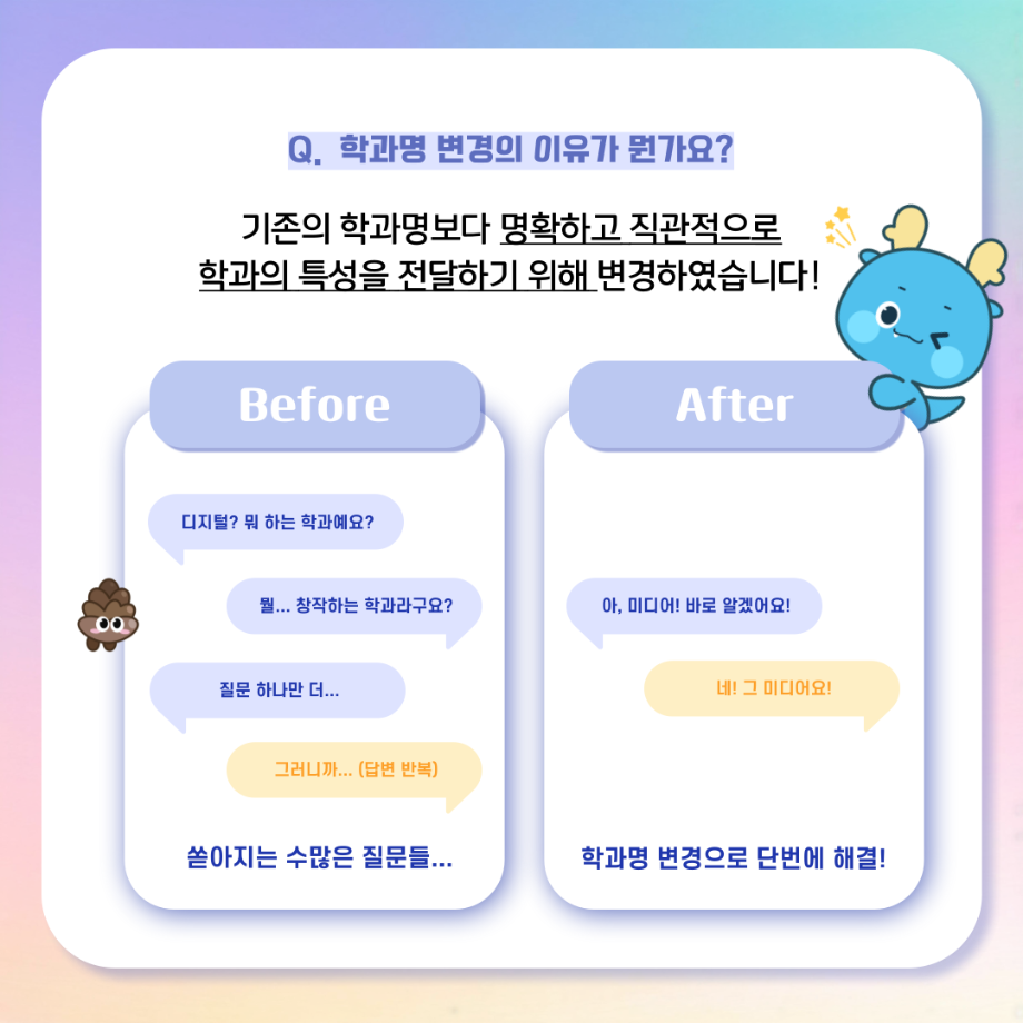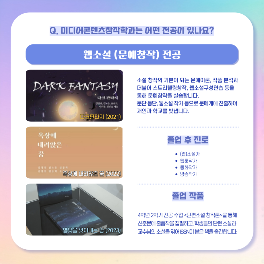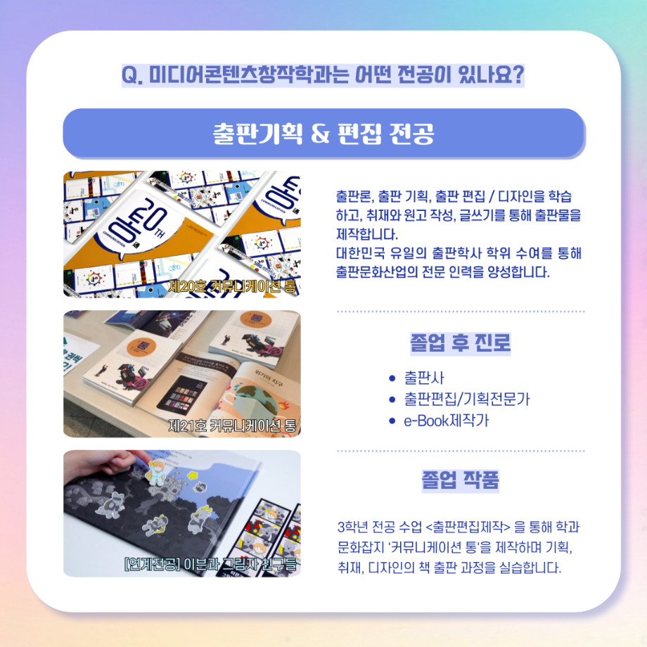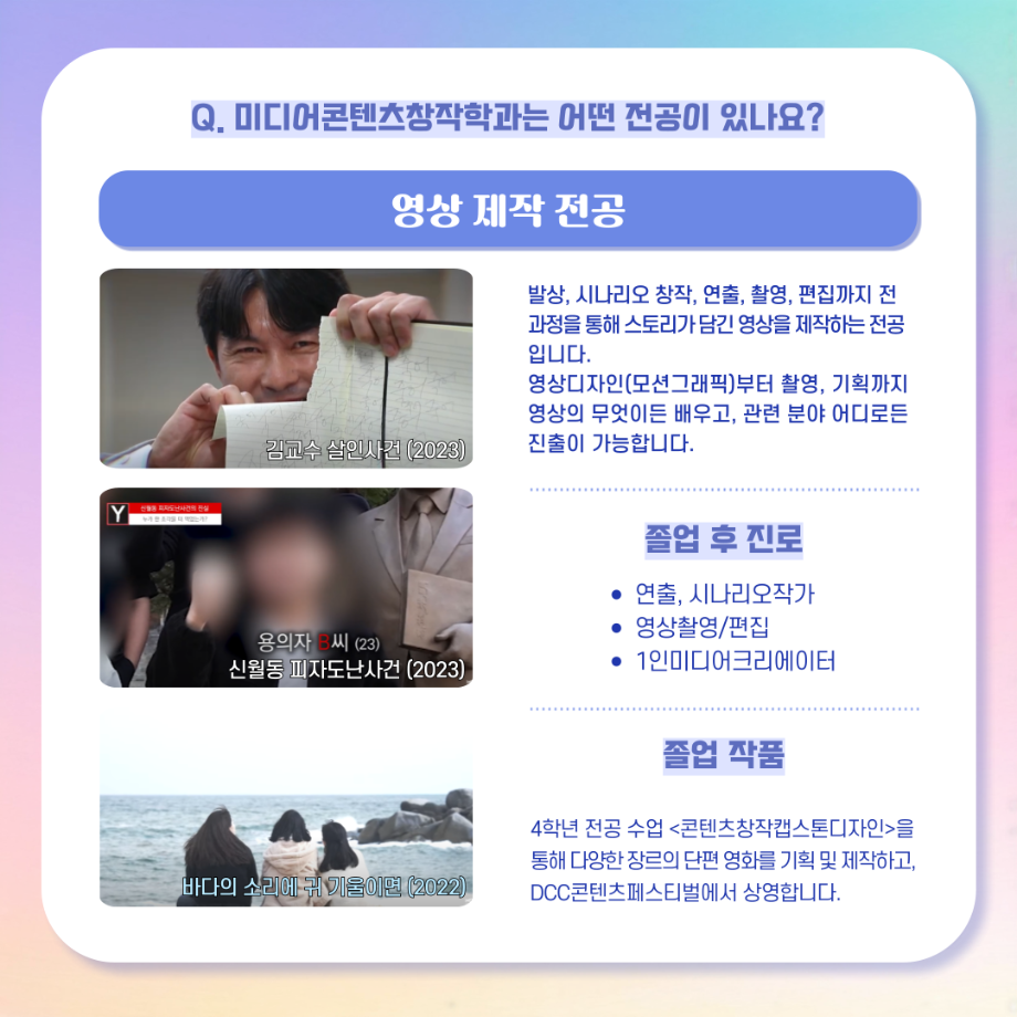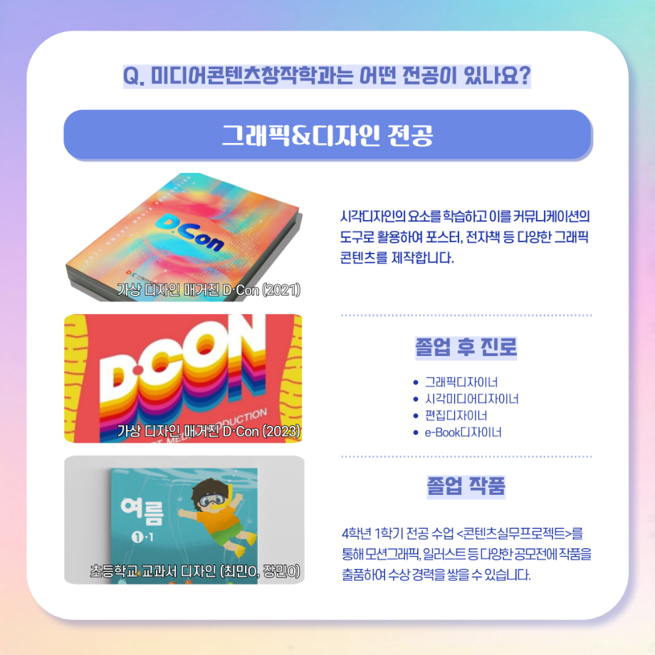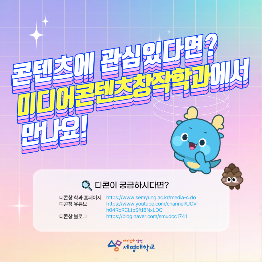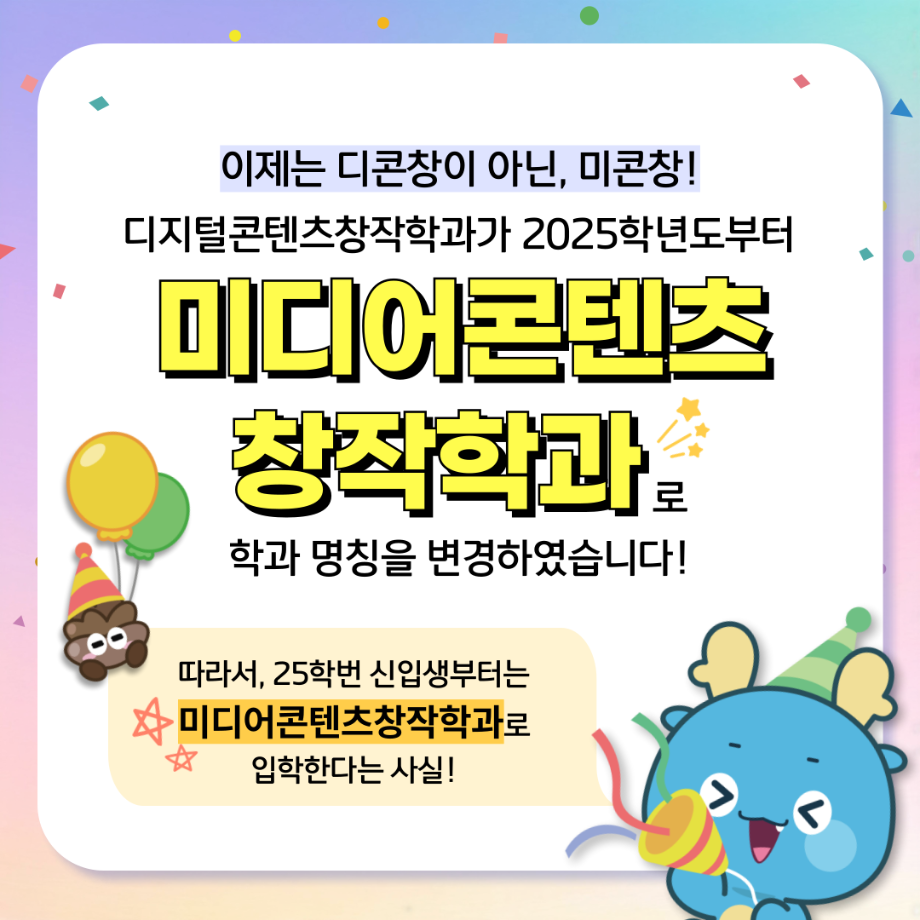 본문 시작 홈으로 MCC News 학과소개 교수소개 학과과정 MCC News MCC SNS 홈페이지가이드 학과 및 재학생 학과 및 재학생 교수 및 졸업생 미디어 정보통 학과 및 재학생 페이스북 트위터 프린트 디콘창, 미디어콘텐츠창작학과로 이름을 변경하다?! 미디어콘텐츠창작학과 2031 2024-09-12 디지털콘텐츠창작학과가 2025년도부터 학과명을 미디어콘텐츠창작학과로 변경하게 되었습니다! 기존 학과명보다 더욱 명확하게 방향성과 특성을 나타내게 되어 정말로 기쁩니다 목록 이전세명대학교에서 알려주는 입시 소식! 다음 2024년 추석맞이 특별 이벤트 담당부서 : 미디어콘텐츠창작학과 담당자 : - 연락처 : 043-649-1741 최종수정일 : 2024-10-26 만족도조사 만족도 조사 이 페이지에서 제공하는 정보에 대하여 만족하시나요? 매우만족 만족 보통 불만족 매우불만족