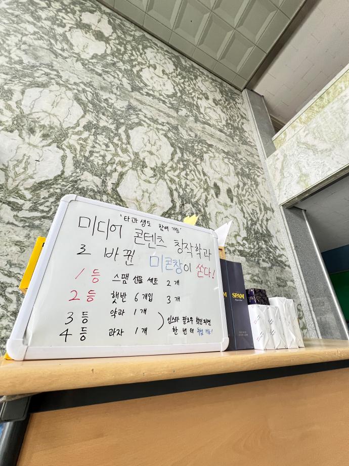 본문 시작 홈으로 MCC News 학과소개 교수소개 학과과정 MCC News MCC SNS 홈페이지가이드 학과 및 재학생 학과 및 재학생 교수 및 졸업생 미디어 정보통 학과 및 재학생 페이스북 트위터 프린트 2024년 추석맞이 특별 이벤트 미디어콘텐츠창작학과 1982 2024-09-13 지난 11일 미디어콘텐츠창작학과 학생회에서 추석맞이 특별 이벤트를 진행했습니다! 추석을 맞이해 학우 여러분들이 뽑기를 통해 다양한 상품을 받아 가셨는데요! 여러분들의 성원에 힘 입어 이벤트 시작 3시간 만에 상품 소진으로 인해 종료하였습니다. 미콘창 학생 뿐만이 아닌 타과 학생 분들도 뽑기에 참여하여 함께 하는 미콘창의 모습을 보여줄 수 있었습니다! 목록 이전디콘창, 미디어콘텐츠창작학과로 이름을 변경하다?! 다음 오랜만에 찾아온 미콘먹거리! 담당부서 : 미디어콘텐츠창작학과 담당자 : - 연락처 : 043-649-1741 최종수정일 : 2024-10-26 만족도조사 만족도 조사 이 페이지에서 제공하는 정보에 대하여 만족하시나요? 매우만족 만족 보통 불만족 매우불만족
