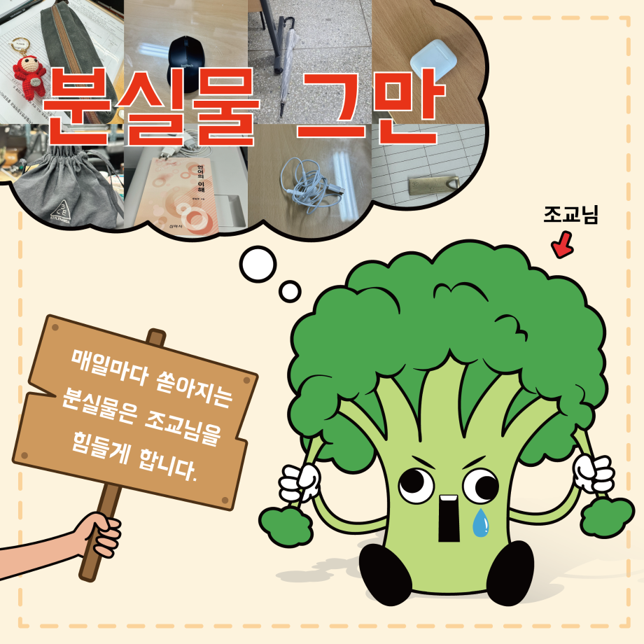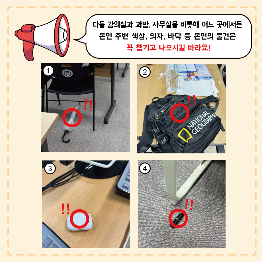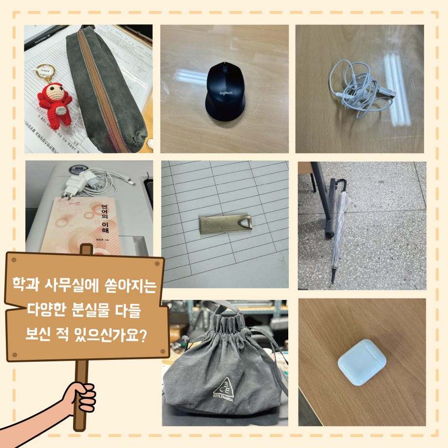본문 시작 홈으로 MCC News 학과소개 교수소개 학과과정 MCC News MCC SNS 홈페이지가이드 학과 및 재학생 학과 및 재학생 교수 및 졸업생 미디어 정보통 학과 및 재학생 페이스북 트위터 프린트 MCC 내 물건은 내가 지키자! 미디어콘텐츠창작학과 2059 2024-10-24 학과 사무실에 쏟아지는 다양한 분실물 다들 보신 적 있으신가요? 매일마다 쏟아지는 분실물은 조교님을 힘들게 합니다. 다들 교실과 과방, 사무실을 비롯해 어느 곳에서든 본인 주변 책상, 의자, 바닥 등 본인의 물건은 꼭 챙기고 나오시길 바라요! 목록 이전2024년도 세명대학교 인문예술대학 문화콘텐츠 창작공모전 개최 다음 🚪MCC 추리 방탈출 "크라임씬"🔎🚪 담당부서 : 미디어콘텐츠창작학과 담당자 : - 연락처 : 043-649-1741 최종수정일 : 2024-10-26 만족도조사 만족도 조사 이 페이지에서 제공하는 정보에 대하여 만족하시나요? 매우만족 만족 보통 불만족 매우불만족