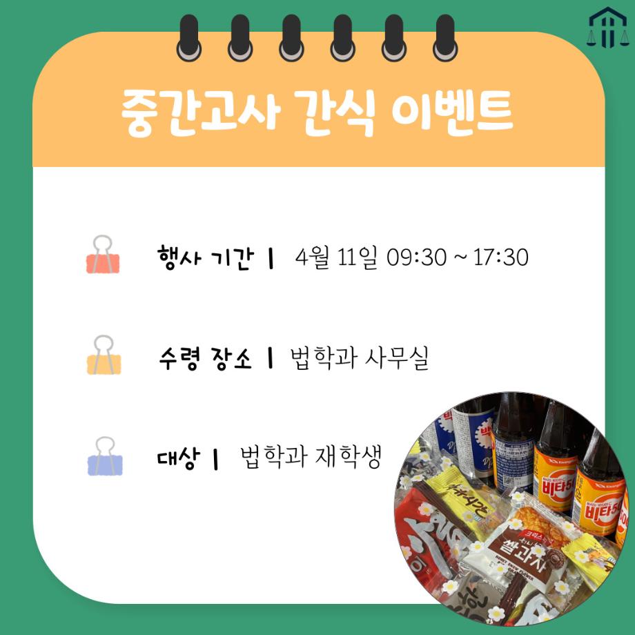 본문 시작 홈으로 커뮤니티 학과안내 교수소개 학과과정 커뮤니티 홈페이지가이드 학과사진첩 공지사항 취업정보 학과사진첩 학과행사 동아리 학생회 교우소식 학과사진첩 페이스북 트위터 프린트 🍫법학과 '하로'의 간식 이벤트🍫 법학과 5325 2023-04-11 🍫법학과 '하로'의 간식 이벤트🍫 🔔EVENT🔔 시험이 얼마 남지 않아서 힘들죠? 🤔 하로가 중간고사 기간 중 법학과 학생분들을 위해 '간식꾸러미'를 준비했어요! :) 소소하지만, 당충전하고 모두 힘내봅시다👍 ✔ 재고 소진 시까지 😆 ✔ 선착순 4월 11일 (화) 09:30~17:30 ✔ 1인 간식꾸러미1개, 음료수1개 세트‼ ✔ 학과 사무실로 오셔서 받아가시면 됩니다👏 목록 이전[법학과 축구동아리 DIKE] 이길 수 있었는데...(중간고사 걱정은 나중에..축구가 먼저다) 다음 [벚꽃세봄] 뿅망치에 줄어든 내 키를 돌리도... 담당부서 : 법학과 담당자 : - 연락처 : 043-649-1764 최종수정일 : 2024-10-26 만족도조사 만족도 조사 이 페이지에서 제공하는 정보에 대하여 만족하시나요? 매우만족 만족 보통 불만족 매우불만족