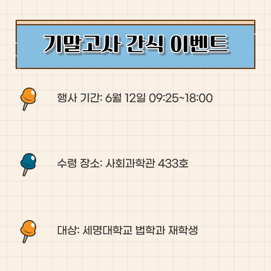 본문 시작 홈으로 커뮤니티 학과안내 교수소개 학과과정 커뮤니티 홈페이지가이드 학과사진첩 공지사항 취업정보 학과사진첩 학과행사 동아리 학생회 교우소식 학과사진첩 페이스북 트위터 프린트 법학과 간식 이벤트🍪 법학과 1559 2025-06-12 법학과 학생회 "다온" 에서 시험으로 지친 학생들을 위해 간식이벤트를 준비했습니다:) 목록 이전2025학년도 법학과 학술캠프 다음 법학과 선배들의 진로 현황 담당부서 : 법학과 담당자 : - 연락처 : 043-649-1764 최종수정일 : 2024-10-26 만족도조사 만족도 조사 이 페이지에서 제공하는 정보에 대하여 만족하시나요? 매우만족 만족 보통 불만족 매우불만족