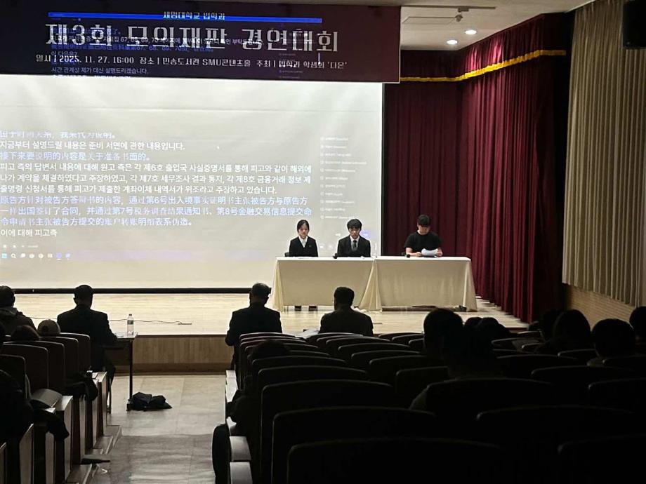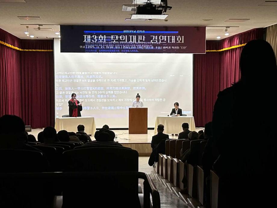 본문 시작 홈으로 커뮤니티 학과안내 교수소개 학과과정 커뮤니티 홈페이지가이드 학과사진첩 공지사항 취업정보 학과사진첩 학과행사 동아리 학생회 교우소식 학과사진첩 페이스북 트위터 프린트 2025학년도 제3회 법학과 모의재판 경연대회 법학과 1443 2025-12-03 2025년 11월 27일 민송도서관 1층 콘텐츠홀에서 법학과 모의재판 경연대회 진행하였습니다. 참여하신 모든 분들 고생 많으셨습니다. 목록 이전2025학년도 법학과 특강 다음 겨울방학 해외 배낭여행-대만 담당부서 : 법학과 담당자 : - 연락처 : 043-649-1764 최종수정일 : 2024-10-26 만족도조사 만족도 조사 이 페이지에서 제공하는 정보에 대하여 만족하시나요? 매우만족 만족 보통 불만족 매우불만족