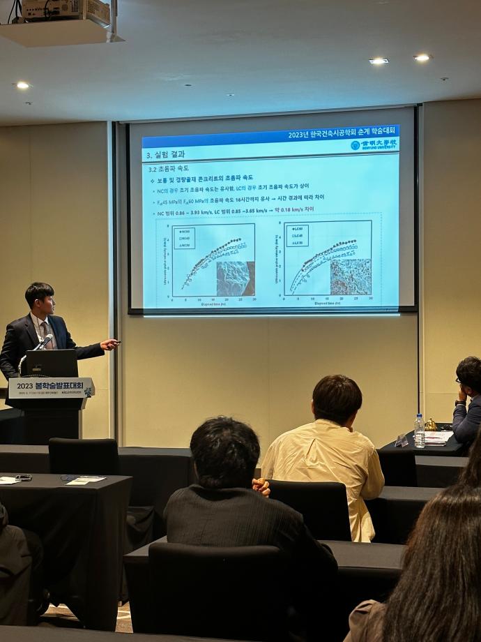 김원창 연구원은 「초기재령에서 보통 및 경량골재 콘크리트의 경과시간에 따른 압축강도 및 초음파 펄스 속도의 평가 」,김태형 연구원은 「초기 재령에서 비소성 황토 혼입율에 따른 콘크리트의 강도 발현 분석 」, 남영진 연구원은 「초기재령에서 초음파 속도법을 활용한 보통 및 경량 골재 콘크리트의 강도 발현 평가」에 대해서 발표하였습니다.
