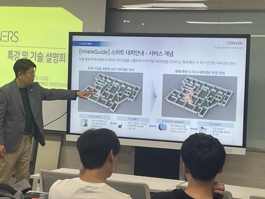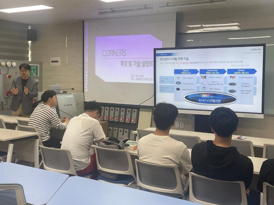 본문 시작 홈으로 커뮤니티 학과소개 교수소개 전공과정 커뮤니티 홈페이지가이드 학과행사 학과공지 채용정보 학사일정 학과행사 동아리 소방방재학과의 자랑 궁금합니다 수험생 Q&A 학과행사 페이스북 트위터 프린트 2023년 (주)코너스 특강 및 기술 설명회 소방방재학과 12311 2023-06-13 2023년 6월 13일 (화)에 (주)코너스에서 세명대학교에 방문하여 특강 및 기술 설명회를 진행하였습니다. 세명대학교 학부생과 대학원생이 청강하였으며, 코너스가 연구하고, 보유하고 있는 기술인 AI, IOT, 디지털 트윈 기술과 스마트 안전 솔루션에 대해 설명하였으며 향후 코너스가 가고자 하는 길에 대해서도 밝히면서, 세명대학교와 함께 걸을 수 있는 길에 대해서 제시하였습니다. 강의를 제공해주신 (주) 코너스 분들에게 감사드립니다. 목록 이전2023년 재난현장 구급대응훈련 다음 2022학년도 학위 수여식 담당부서 : 소방방재학과 담당자 : - 연락처 : 043-649-1787 최종수정일 : 2024-10-26 만족도조사 만족도 조사 이 페이지에서 제공하는 정보에 대하여 만족하시나요? 매우만족 만족 보통 불만족 매우불만족