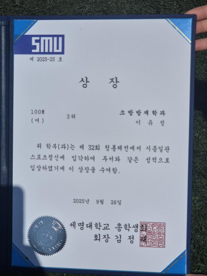 본문 시작 홈으로 커뮤니티 학과소개 교수소개 전공과정 커뮤니티 홈페이지가이드 학과행사 학과공지 채용정보 학사일정 학과행사 동아리 소방방재학과의 자랑 궁금합니다 수험생 Q&A 학과행사 페이스북 트위터 프린트 2025학년도 제32회 청룡체전 소방방재학과 소방방재학과 1840 2025-09-23 2025년 9월 23일 ~9월 25일 제32회 청룡체전 기간동안 여자 피구, 남자 축구, 남자 농구, 혼성 계주, 여자 100m, 남자 100m 참가하였습니다. 선수분들 모두 수고하셨고, 응원해주신 학우분들 감사드립니다! 목록 이전KICT 화재안전연구소 견학 다음 2026학년도 세명대학교 소방방재학과 꿈 설계학기 담당부서 : 소방방재학과 담당자 : - 연락처 : 043-649-1787 최종수정일 : 2024-10-26 만족도조사 만족도 조사 이 페이지에서 제공하는 정보에 대하여 만족하시나요? 매우만족 만족 보통 불만족 매우불만족