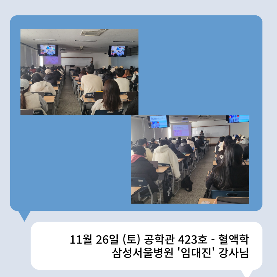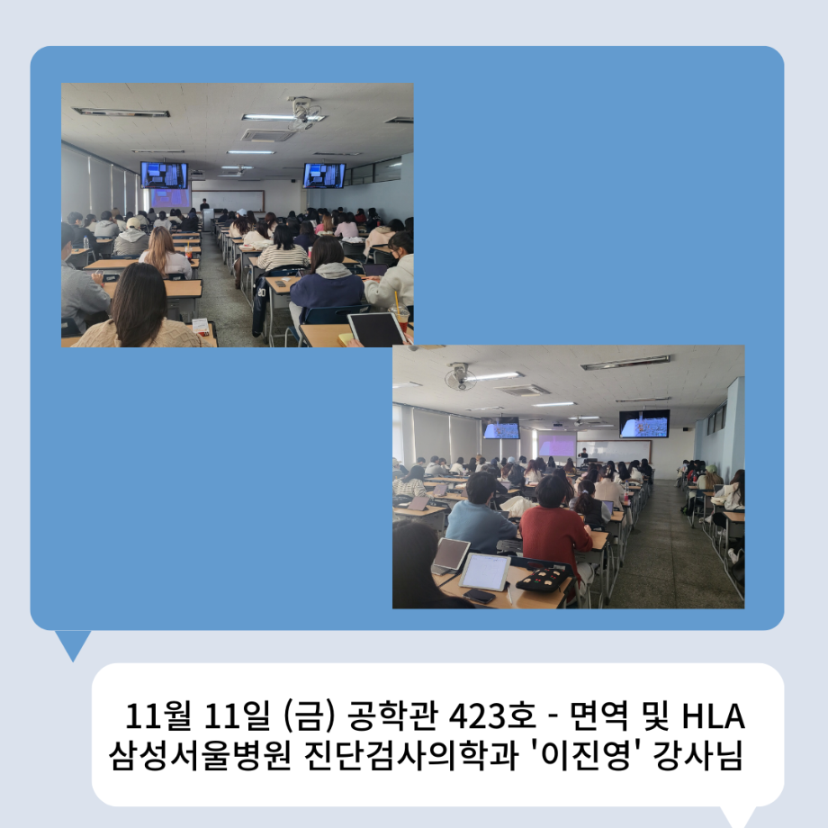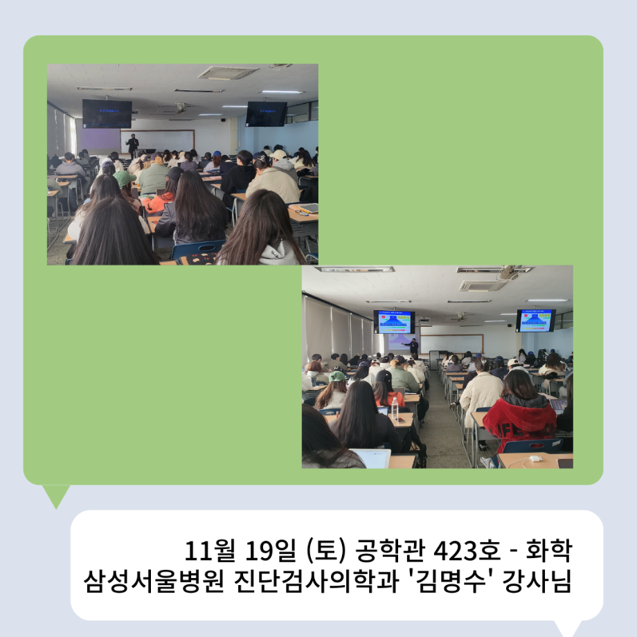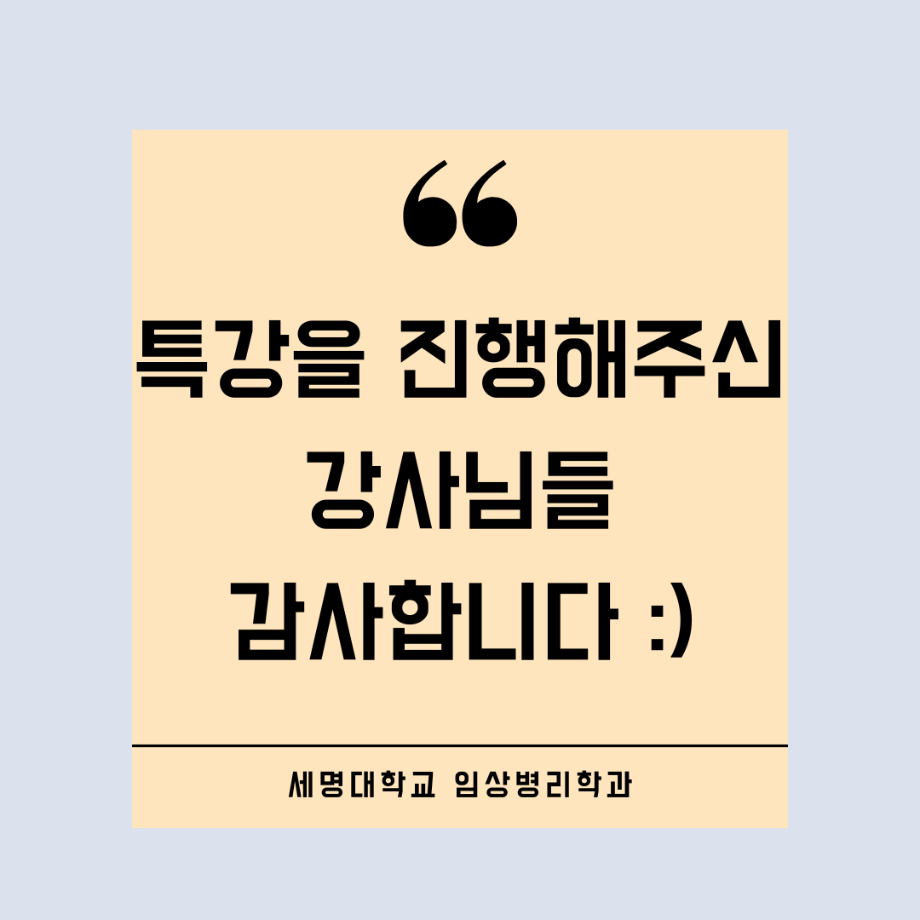 본문 시작 👨🔬2022년 3학년 실습특강👨🔬 임상병리학과 7011 2023-01-16 2022년 3학년 병원 실습 특강을 대신하여 각 분야의 강사님들을 초빙하여 강의를 진행해 주셨습니다. 병원실습을 못 간 대신 병원과 취업에 대해 궁금한 것에 대해 질문도 하는 유익한 시간이었습니다~ ✨ 강의를 진행해 주신 강사님들 감사합니다 🙂 ✨ 목록 이전🤖 3학년 세균학및실험 수업 실습영상 🤖 - 3주차 다음 2022 임상병리학과 MT 담당부서 : 임상병리학과 담당자 : - 연락처 : 043-649-1537 최종수정일 : 2024-10-26 만족도조사 만족도 조사 이 페이지에서 제공하는 정보에 대하여 만족하시나요? 매우만족 만족 보통 불만족 매우불만족