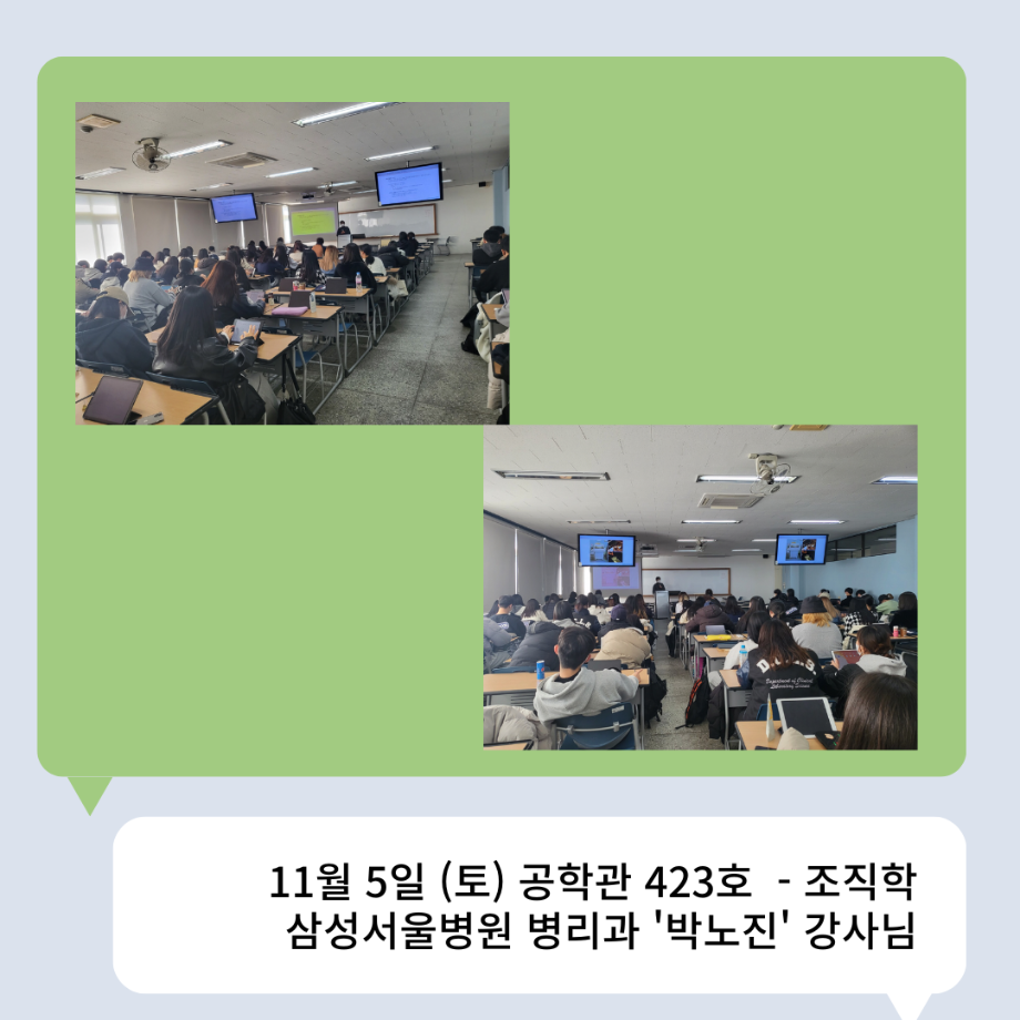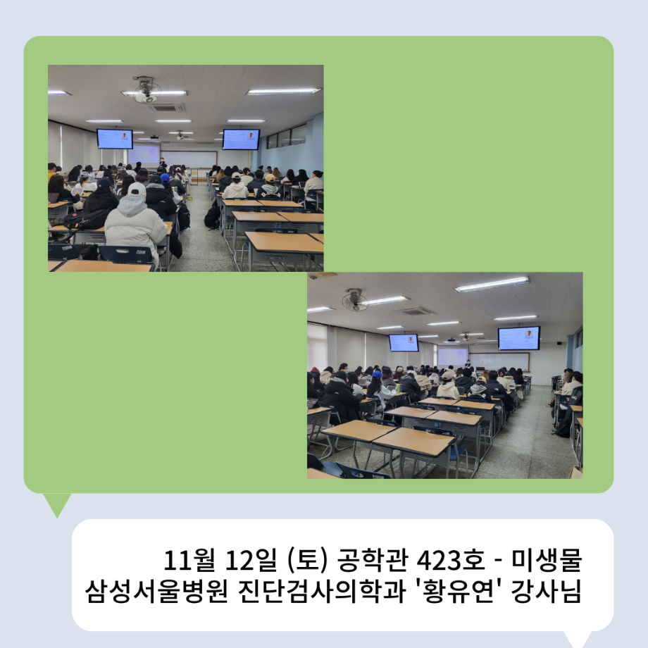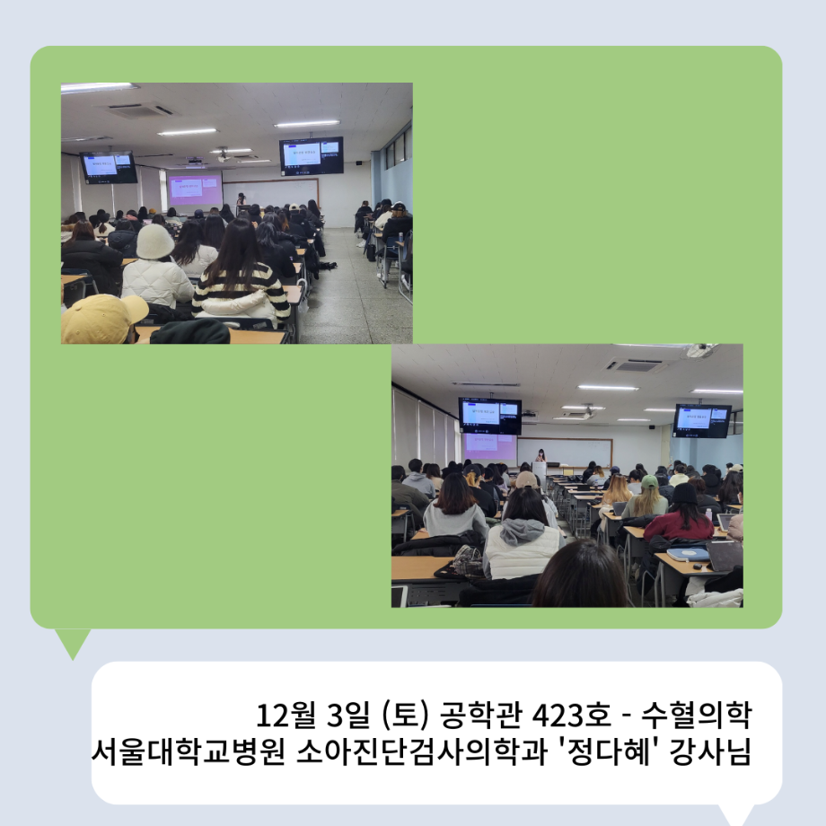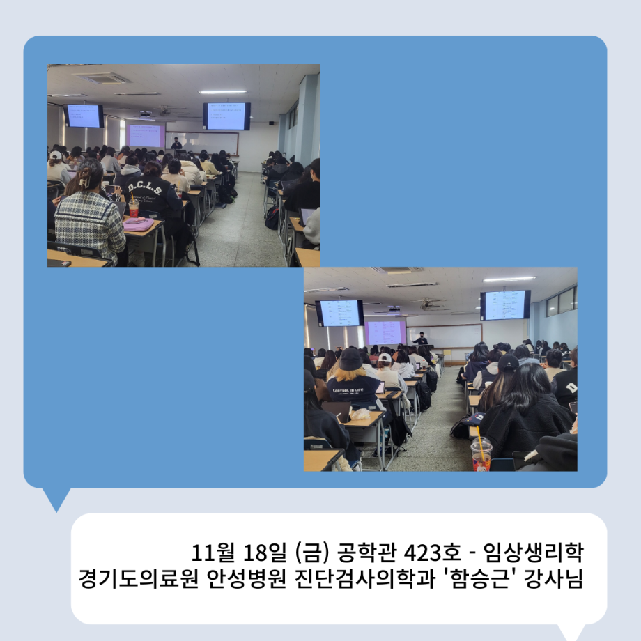 본문 시작 👨🔬2022년 3학년 실습특강👨🔬 임상병리학과 7011 2023-01-16 2022년 3학년 병원 실습 특강을 대신하여 각 분야의 강사님들을 초빙하여 강의를 진행해 주셨습니다. 병원실습을 못 간 대신 병원과 취업에 대해 궁금한 것에 대해 질문도 하는 유익한 시간이었습니다~ ✨ 강의를 진행해 주신 강사님들 감사합니다 🙂 ✨ 목록 이전🤖 3학년 세균학및실험 수업 실습영상 🤖 - 3주차 다음 2022 임상병리학과 MT 담당부서 : 임상병리학과 담당자 : - 연락처 : 043-649-1537 최종수정일 : 2024-10-26 만족도조사 만족도 조사 이 페이지에서 제공하는 정보에 대하여 만족하시나요? 매우만족 만족 보통 불만족 매우불만족
