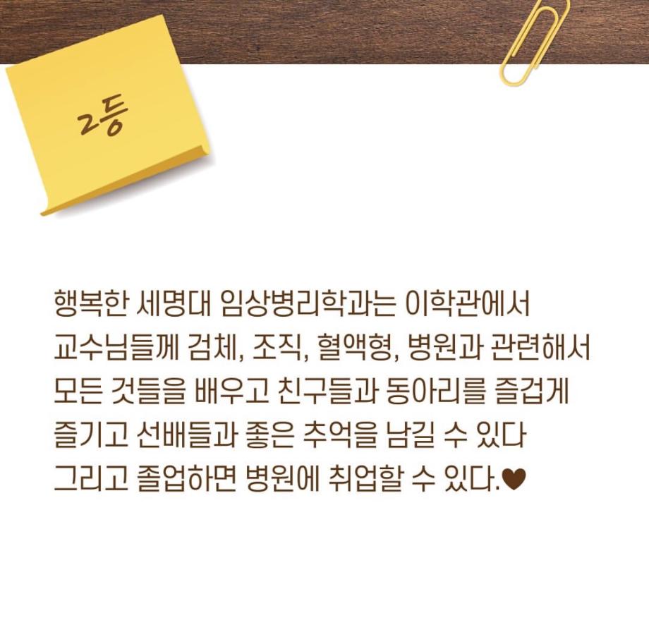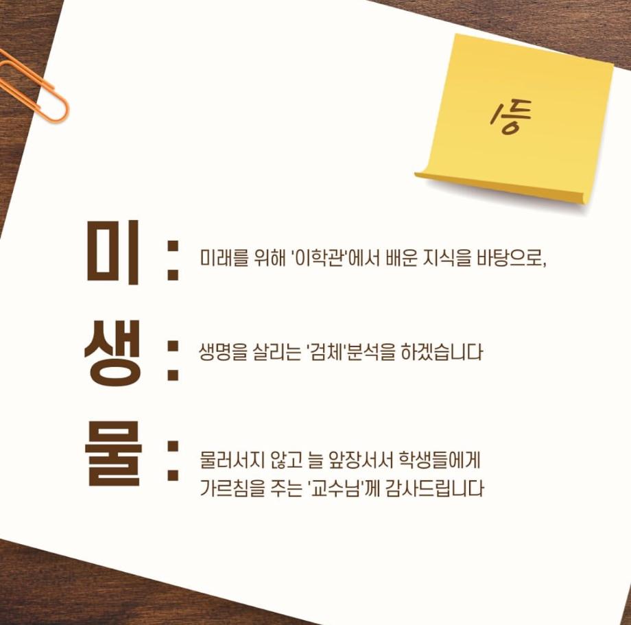 본문 시작 9월 학과 문장만들기 임상병리학과 2293 2024-10-03 9월 학과 개설된 달 기념 3행시, 문장 만들기 이벤트 우수작 총 15개를 선정하였지만 사진 제한이 있어 다 올리지는 못하였습니다 ! 상품은 다음 주 중으로 증정해 드릴 예정입니다 :) 이번 이벤트에 많은 관심을 가져주셔서 감사합니다. 다음에도 좋은 이벤트가 기다리고 있으니 기대해주시길 바랍니다 ! 목록 이전헌혈 버스 다음 중간고사 학용품 이벤트 담당부서 : 임상병리학과 담당자 : - 연락처 : 043-649-1537 최종수정일 : 2024-10-26 만족도조사 만족도 조사 이 페이지에서 제공하는 정보에 대하여 만족하시나요? 매우만족 만족 보통 불만족 매우불만족