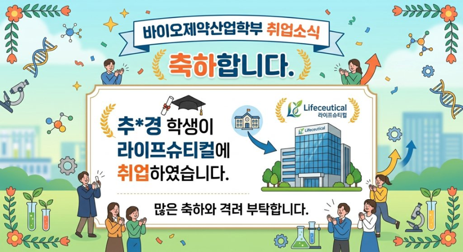 본문 시작 홈으로 학부자료실 학부소개 교육과정 학부공지게시판 학부자료실 홈페이지가이드 학부행사 및 사진게시판 학부행사 및 사진게시판 학생회 소개 학부행사 및 사진게시판 페이스북 트위터 프린트 축하합니다. 추*경 학생이 라이프 슈티컬에 취업하였습니다. 바이오제약산업학부 11 2026-04-27 축하합니다. 추*경 학생이 라이프 슈티컬에 취업하였습니다. 목록 이전GC-MS 기기 활용 활동 다음 축하합니다. 이*서 학생이 시마즈사이언티픽코리아에 취업하였습니다. 담당부서 : 바이오제약산업학부 담당자 : - 연락처 : 043-649-1729 최종수정일 : 2024-10-26 만족도조사 만족도 조사 이 페이지에서 제공하는 정보에 대하여 만족하시나요? 매우만족 만족 보통 불만족 매우불만족