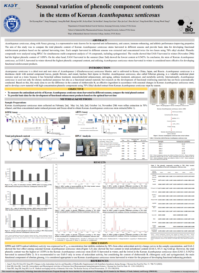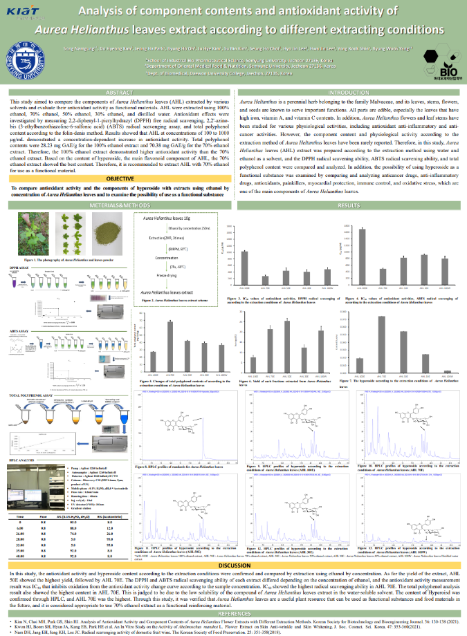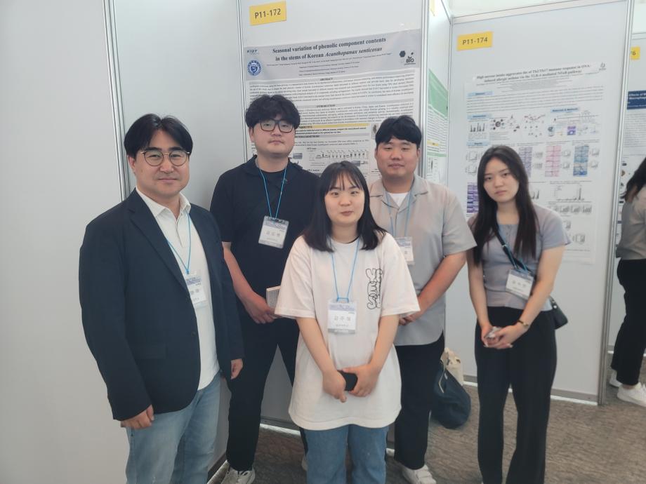 세명대학교 바이오제약산업학부 양병욱 교수 연구실에서는 제주도 국제컨벤션센터에서 개최된 2023 한국식품과학회 (2023 KoSFoST International Symposium and Annual Meeting Sustainable Food Innovation: A Bridge to the Future for All)에 참석하여 김도형(박사과정), 박정하, 남궁송(석사과정), 오병호, 김주혜, 김수빈(학부생)의 연구 결과 논문 Seasonal variation of phenolic component contents in the stems of Korean Acanthopanax senticosus과 Analysis of component contents and antioxidant activity of Aurea Helianthus leaves extract according to different extracting conditions를 발표하였다.