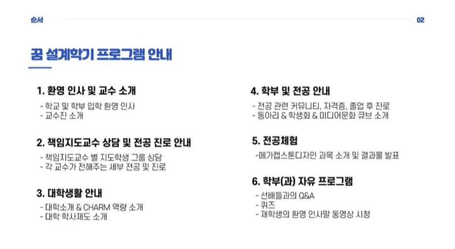 본문 시작 홈으로 학부소식 학부소개 교육과정 학부소식 커뮤니티 홈페이지가이드 학부행사 공지사항 학사일정 학부행사 미문뉴스 미문한컷 포토갤러리 학부행사 페이스북 트위터 프린트 [2월의 행사] 꿈설계학기 미디어문화학부 2450 2022-07-01 2022학년도 미디어문화학부 꿈 설계학기가 성황리에 마무리 되었습니다! Q&A와 퀴즈에 열정적으로 참여해주신 22학번 신입생 여러분들, 전공체험 소개를 맡아주신 선배님 감사합니다. 비대면으로 진행되어 아쉬운 부분도 있었지만, 모두에게 유익하고 즐거운 시간이 되었기를 바랍니다. 건강한 모습으로 학교에서 만날 수 있길 기대하고 있겠습니다! 신입생 여러분들의 학교 및 학부 생활을 응원합니다. 목록 이전[12월의 행사]미디어문화학부 국제인증 ACP일러스트 자격증 특강 프로그램 운영 다음 [3월의 행사] 신입생 환영회 담당부서 : 미디어문화학부 담당자 : - 연락처 : 043-649-1760 최종수정일 : 2024-10-26 만족도조사 만족도 조사 이 페이지에서 제공하는 정보에 대하여 만족하시나요? 매우만족 만족 보통 불만족 매우불만족