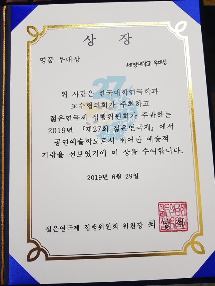 본문 시작 홈으로 커뮤니티 학과소개 교수소개 학과과정 커뮤니티 작품DB 서울대학로 민송아트홀 홈페이지가이드 사진자료실 학과공지 전공자료실 사진자료실 사진자료실 페이스북 트위터 프린트 [공연영상학과] 제 27회 젊은연극제 무대상 수상 공연영상학과 5941 2019-06-29 2019년 6월 29일, 제 27회 젊은연극제 폐막식과 시상식이 서울 대학로에서 진행되었습니다. 폐막식과 시상식에는 행사를 위해 힘써주신 관계자분들과 각 학교에 대표수상자들이 자리를 빛내주었는데요, 이날, 작품의 무대감독이었던 오창준 학생이 대표수상자로써 명품무대상을 수상하는 영광을 얻게 되었습니다. 젊은연극제 참가를 위해 애써주신 담당교수님들과, 학과생 여러분들. 모두들 고생많으셨고, 수상을 진심으로 축하드립니다! 목록 이전[공연영상학과] 제 27회 젊은연극제 참가작 " 니 부모 얼굴이 보고싶다 " 다음 [공연영상학과] JTBC 드라마 '우아한 친구들' 촬영지 제공 담당부서 : 공연영상학과 담당자 : - 연락처 : 043-649-1429 최종수정일 : 2024-10-26 만족도조사 만족도 조사 이 페이지에서 제공하는 정보에 대하여 만족하시나요? 매우만족 만족 보통 불만족 매우불만족