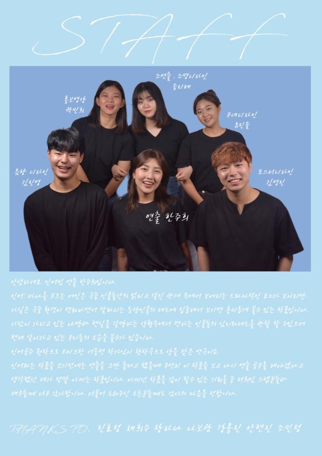 본문 시작 홈으로 커뮤니티 학과소개 교수소개 학과과정 커뮤니티 작품DB 서울대학로 민송아트홀 홈페이지가이드 사진자료실 학과공지 전공자료실 사진자료실 사진자료실 페이스북 트위터 프린트 [공연영상학과] 하계프로젝트 " 인어;바다를 부르는 여인 " 공연영상학과 5773 2019-10-15 연출 : 한주희 조연출 : 송지혜 배우 : 원성준, 임현자, 김수영, 이종화 무대디자인 : 유진솔 조명디자인: 송지혜 음향디자인: 김진영 포스터디자인: 김영진 홍보영상 : 곽민희 목록 이전[공연영상학과] 영상장비교육 다음 [공연영상학과] 2019학년도 졸업영화제 '어쩌다 졸업,' 담당부서 : 공연영상학과 담당자 : - 연락처 : 043-649-1429 최종수정일 : 2024-10-26 만족도조사 만족도 조사 이 페이지에서 제공하는 정보에 대하여 만족하시나요? 매우만족 만족 보통 불만족 매우불만족
