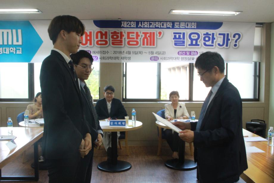 본문 시작 홈으로 커뮤니티 대학소개 학과소개 입학안내 커뮤니티 홈페이지가이드 포토갤러리 대학소식 자료실 포토갤러리 포토갤러리 페이스북 트위터 프린트 제2회 사회과학대학 토론대회 시상식 사회과학대학 6080 2018-05-30 열띤 토론 끝에 호텔관광경영학과의 ‘최종병기’ 팀이 최우수상을 수상했습니다. 최우수상 수상팀에게 직접 상장 수여를 하시기 위해 대회장을 찾아주신 이용걸 총장님께 감사드립니다. 이것으로 제2회 사회과학대학 토론대회가 성황리에 마쳤습니다. 대회 지원을 위해 도와주신 교직원 여러분과 토론대회에 참여해주신 많은 학생들께 진심으로 감사드립니다. 목록 이전제2회 사회과학대학 토론대회 현장스케치2 다음 2018학년도 사회과학대학 취업특화프로그램 설명회 담당부서 : 사회과학대학 담당자 : - 연락처 : 043-649-7412 최종수정일 : 2024-10-26 만족도조사 만족도 조사 이 페이지에서 제공하는 정보에 대하여 만족하시나요? 매우만족 만족 보통 불만족 매우불만족