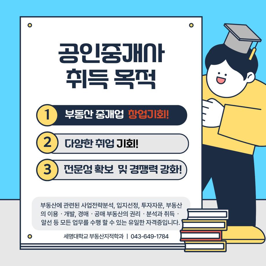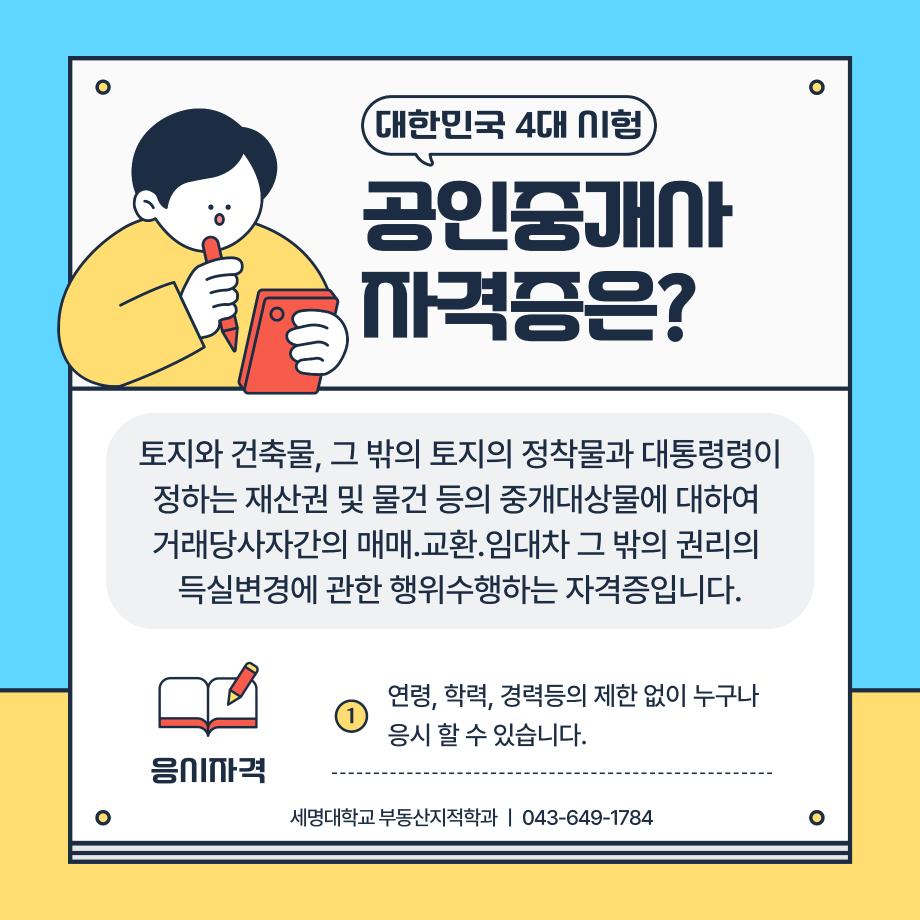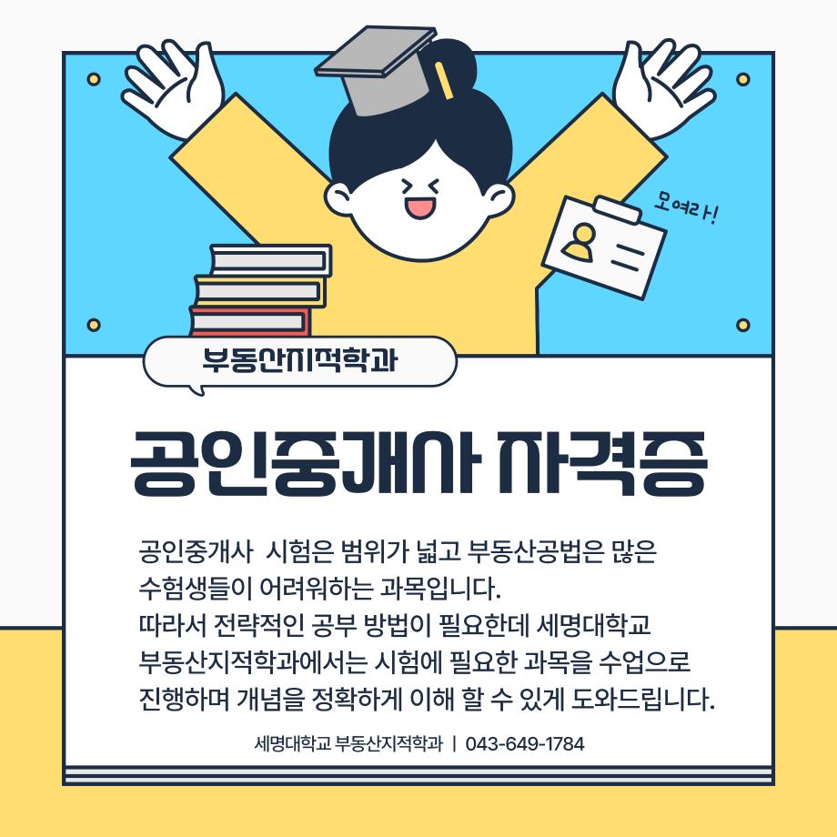 본문 시작 홈으로 학과 소식 학과소개 취업 및 진로 언론 및 보도 학과 소식 대학원 홈페이지가이드 행사사진게시판 행사사진게시판 공지사항 일반자료실 강의자료실 부동산학보 동아리 행사사진게시판 페이스북 트위터 프린트 공인중개사 소개카드 부동산지적학과 2314 2024-11-20 공인중개사 소개 카드입니다. 공인중개사에 관심있는 학생들은 참고하여 주세요. 목록 이전2024학년도 제 35회 부동산지적학과 학술특강 다음 지적기사 소개 카드 담당부서 : 부동산지적학과 담당자 : - 연락처 : 043-649-1784 최종수정일 : 2024-10-26 만족도조사 만족도 조사 이 페이지에서 제공하는 정보에 대하여 만족하시나요? 매우만족 만족 보통 불만족 매우불만족