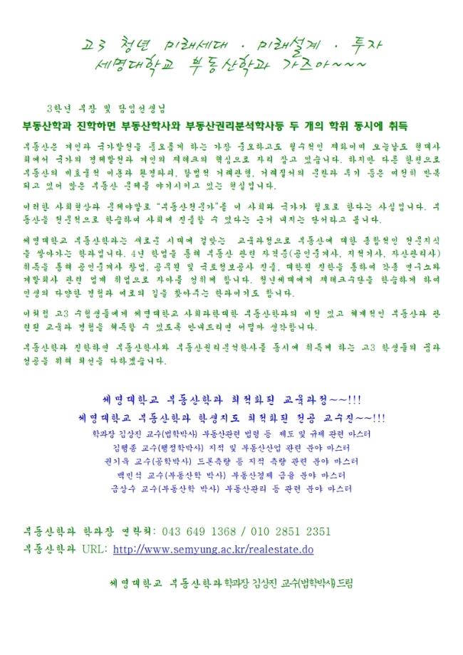 본문 시작 홈으로 학과 소식 학과소개 취업 및 진로 언론 및 보도 학과 소식 대학원 홈페이지가이드 행사사진게시판 행사사진게시판 공지사항 일반자료실 강의자료실 부동산학보 동아리 행사사진게시판 페이스북 트위터 프린트 세명대학교 부동산학과 수시 입시자료 부동산학과 6322 2020-09-21 세명대학교 홈페이지에 있는 2021학년도 세명대학교 수시 입시자료입니다. 2021년도 입시에서 세명대학교 진학을 희망하는 예비 신입생, 부모님, 선생님 및 관심 있으신 분들께서는 참조해주시면 감사드리겠습니다. 목록 이전제 5 회 공간정보 활용 창업 아이디어 공모전 다음 LH, '남북교류와 미래 국토비전' 작품 공모전 개최 담당부서 : 부동산지적학과 담당자 : - 연락처 : 043-649-1784 최종수정일 : 2024-10-26 만족도조사 만족도 조사 이 페이지에서 제공하는 정보에 대하여 만족하시나요? 매우만족 만족 보통 불만족 매우불만족