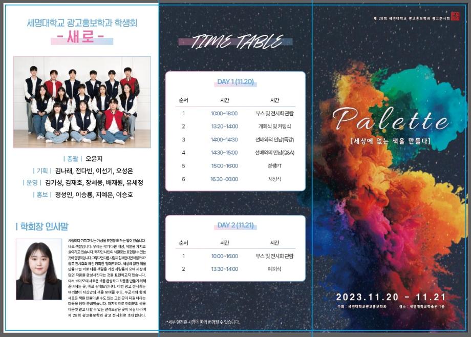 본문 시작 홈으로 특별CC프로그램 매력적인 학과소개 흥미로운 교육과정 특별CC프로그램 We can 취업 따뜻한 커뮤니티 홈페이지가이드 광고전시회 광고전시회 광고영상 제작실습 광고디자인 자격증취득 C&E(도전!경험!) 작품 작품 활동 작품 페이스북 트위터 프린트 [2023년도]제28회광고전시회 광고홍보학과 6184 2023-11-18 2023년도 제 28회 광고홍보학과 광고전시회 개최 팔레트 [세상에 없는 색을 만들다] 목록 이전[2022년도]제27회 광고전시회 다음 [2024년도]제29회 광고전시회