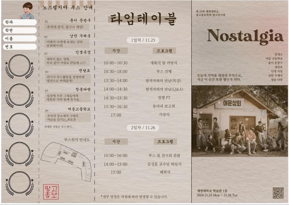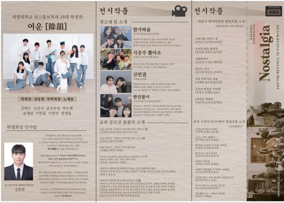본문 시작 홈으로 특별CC프로그램 매력적인 학과소개 흥미로운 교육과정 특별CC프로그램 We can 취업 따뜻한 커뮤니티 홈페이지가이드 광고전시회 광고전시회 광고영상 제작실습 광고디자인 자격증취득 C&E(도전!경험!) 작품 작품 활동 작품 페이스북 트위터 프린트 [2024년도]제29회 광고전시회 광고홍보학과 3964 2024-12-04 제29회 광고전시회 노스탤지아 목록 이전[2023년도]제28회광고전시회 다음 [2025년도]제30회광고전시회