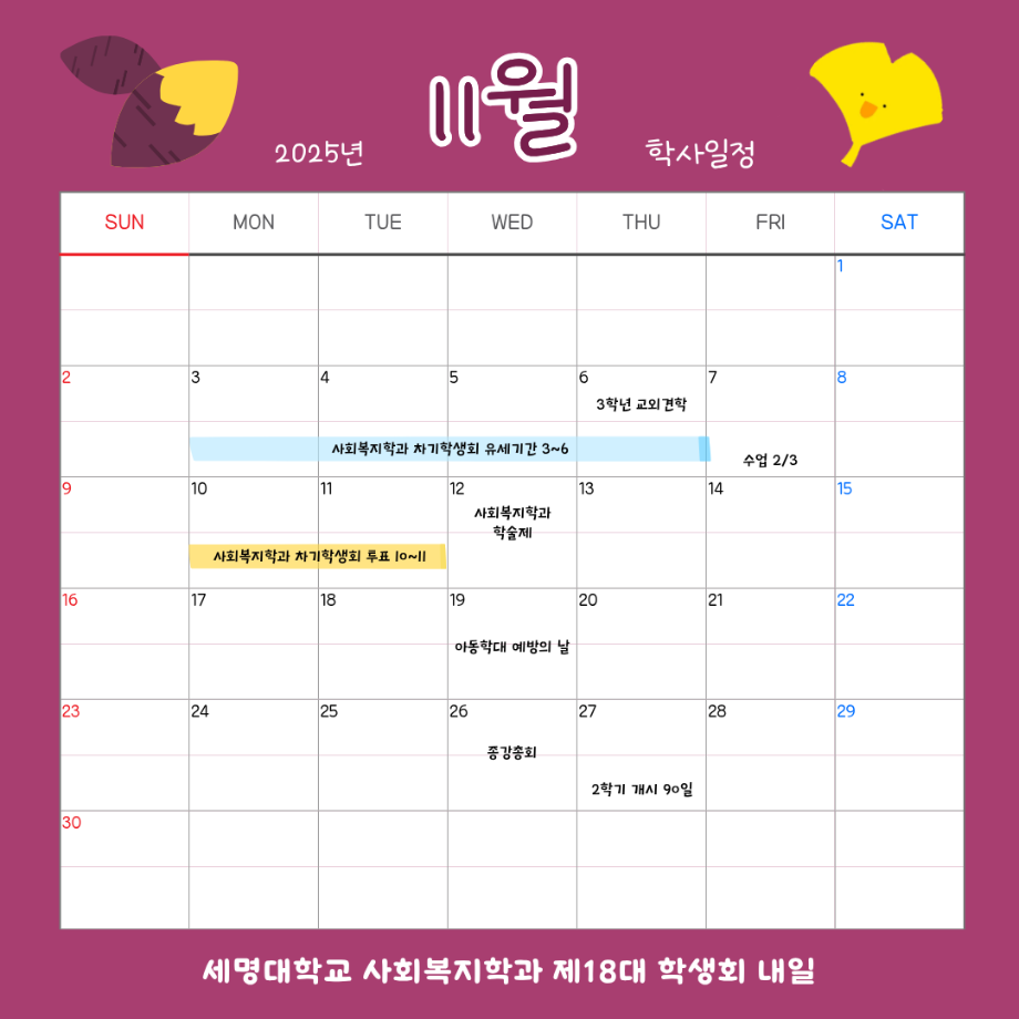 본문 시작 홈으로 커뮤니티 학과소개 교수소개 교육과정 현장실습 및 취업정보 커뮤니티 홈페이지가이드 학사일정 학과공지 학사일정 학생회 동아리 학생 소통 광장 포토갤러리 전공자료실 서식자료실 학사일정 페이스북 트위터 프린트 11월 학사 일정 사회복지학과 683 2025-10-30 11월 학사 일정 입니다. 목록 이전10월 학사 일정 다음 12월 학사 일정 담당부서 : 사회복지학과 담당자 : - 연락처 : 043-649-1799 최종수정일 : 2024-10-26 만족도조사 만족도 조사 이 페이지에서 제공하는 정보에 대하여 만족하시나요? 매우만족 만족 보통 불만족 매우불만족