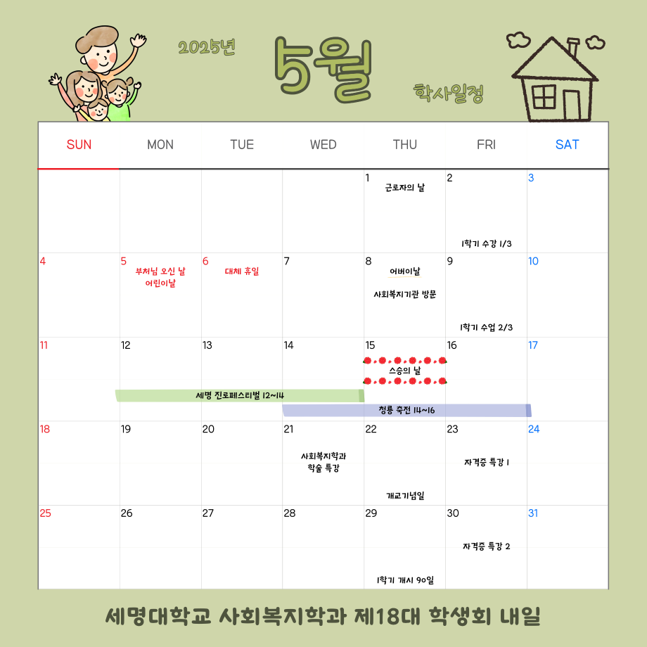 본문 시작 홈으로 커뮤니티 학과소개 교수소개 교육과정 현장실습 및 취업정보 커뮤니티 홈페이지가이드 학사일정 학과공지 학사일정 학생회 동아리 학생 소통 광장 포토갤러리 전공자료실 서식자료실 학사일정 페이스북 트위터 프린트 5월 학사 일정 사회복지학과 784 2025-09-04 2025학년도 5월 학사 일정입니다. 목록 이전4월 학사 일정 다음 6월 학사 일정 담당부서 : 사회복지학과 담당자 : - 연락처 : 043-649-1799 최종수정일 : 2024-10-26 만족도조사 만족도 조사 이 페이지에서 제공하는 정보에 대하여 만족하시나요? 매우만족 만족 보통 불만족 매우불만족