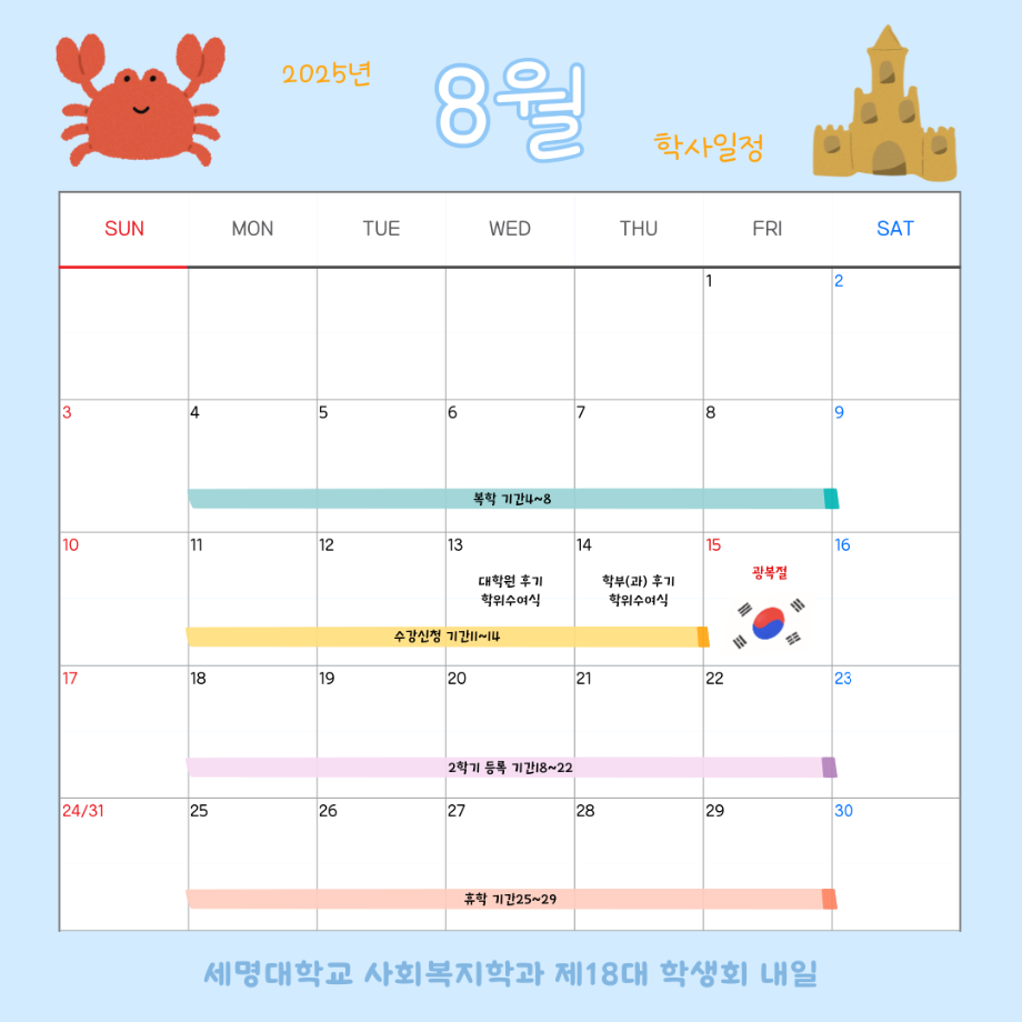 본문 시작 홈으로 커뮤니티 학과소개 교수소개 교육과정 현장실습 및 취업정보 커뮤니티 홈페이지가이드 학사일정 학과공지 학사일정 학생회 동아리 학생 소통 광장 포토갤러리 전공자료실 서식자료실 학사일정 페이스북 트위터 프린트 8월 학사 일정 사회복지학과 893 2025-09-04 2025학년도 8월 학사 일정입니다. 목록 이전6월 학사 일정 다음 9월 학사 일정 담당부서 : 사회복지학과 담당자 : - 연락처 : 043-649-1799 최종수정일 : 2024-10-26 만족도조사 만족도 조사 이 페이지에서 제공하는 정보에 대하여 만족하시나요? 매우만족 만족 보통 불만족 매우불만족
