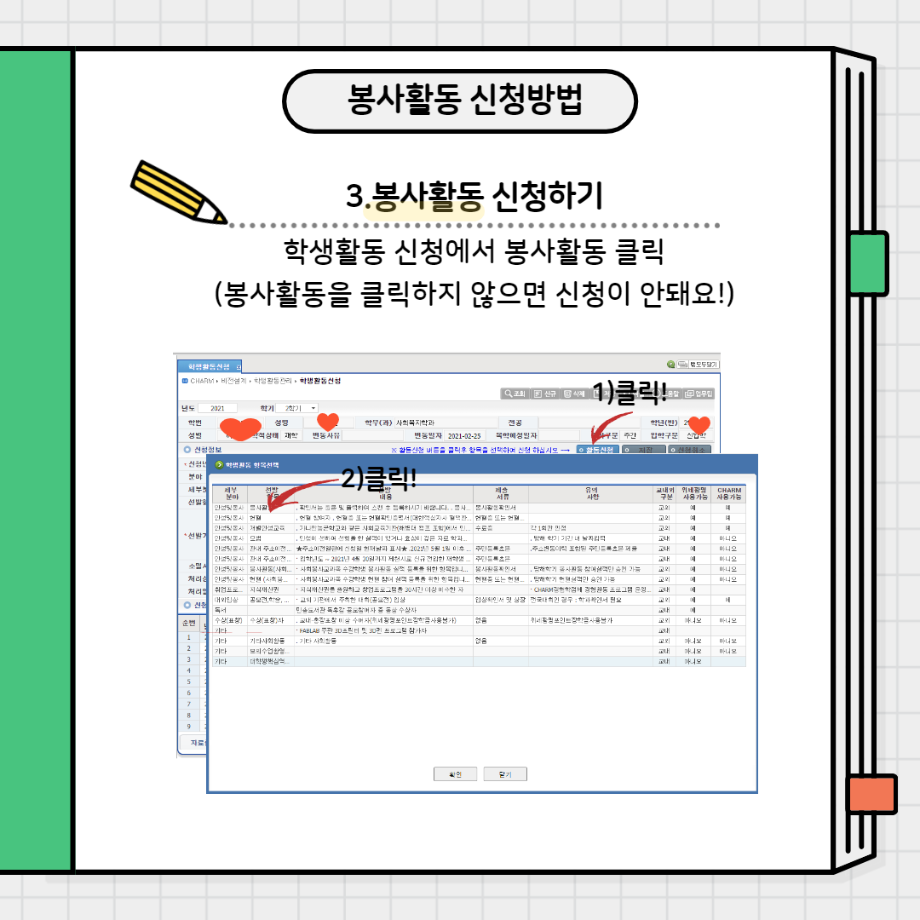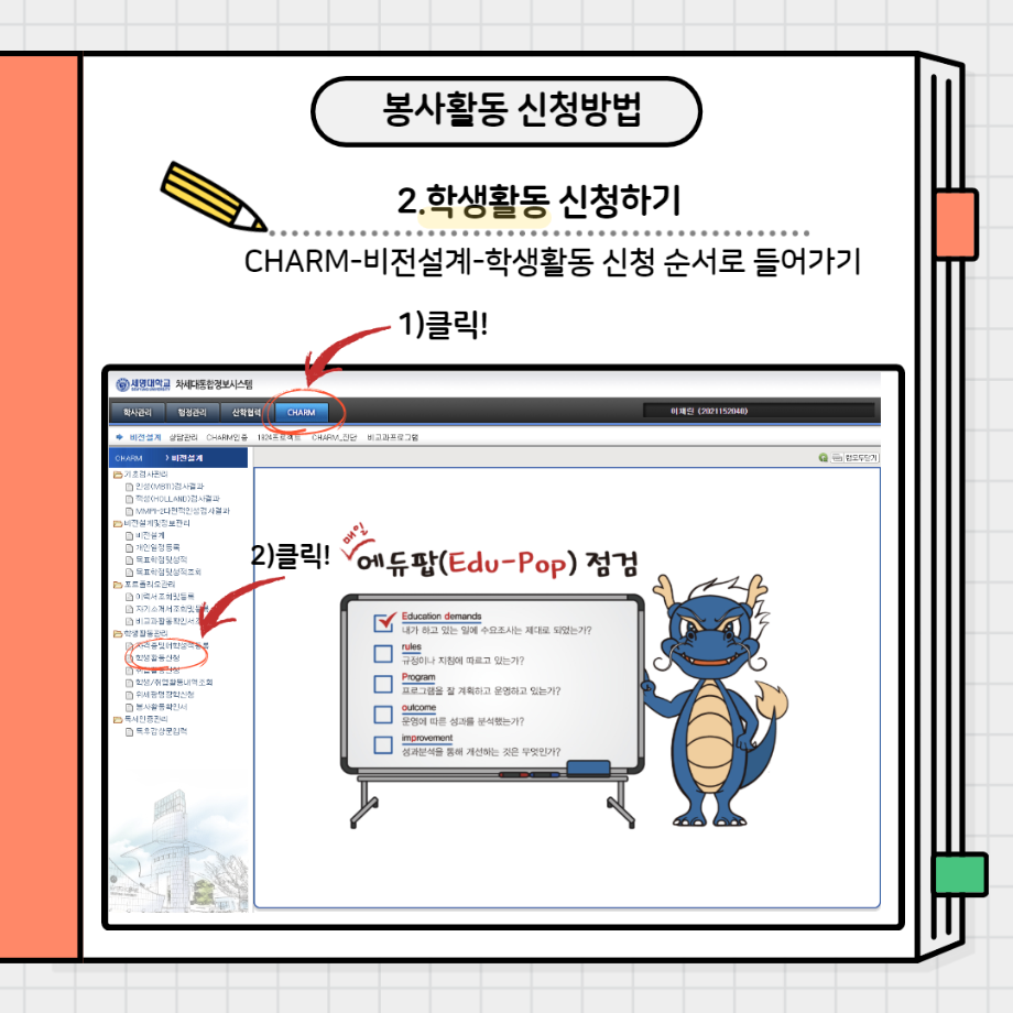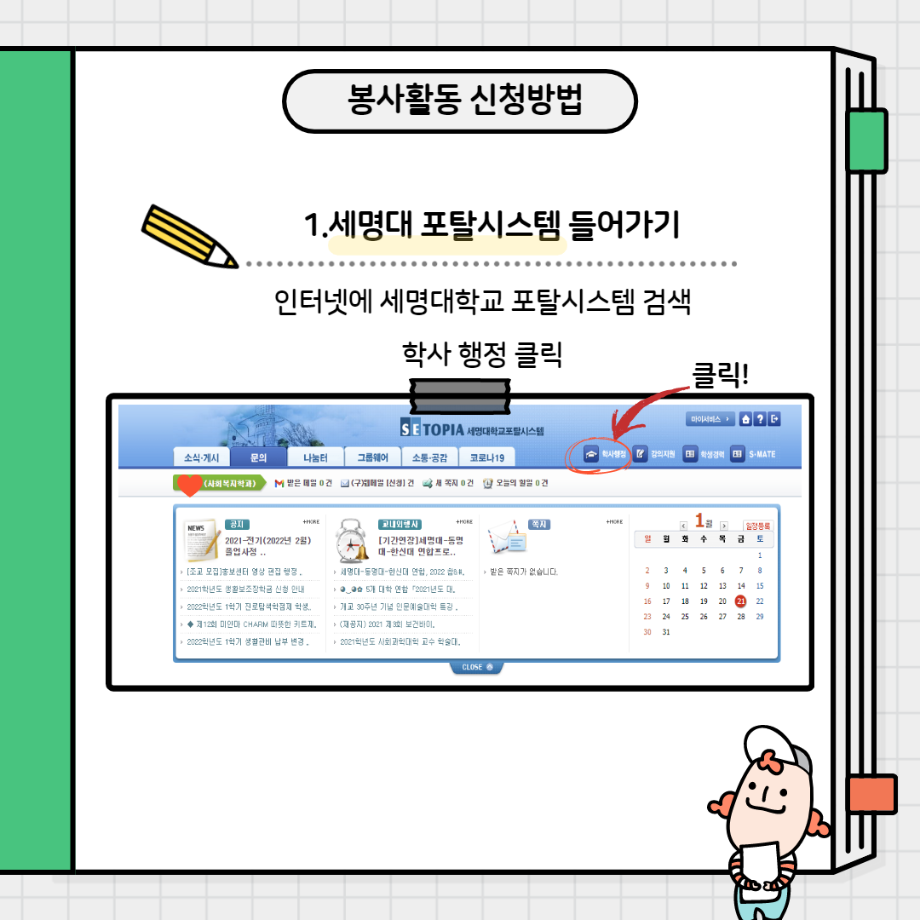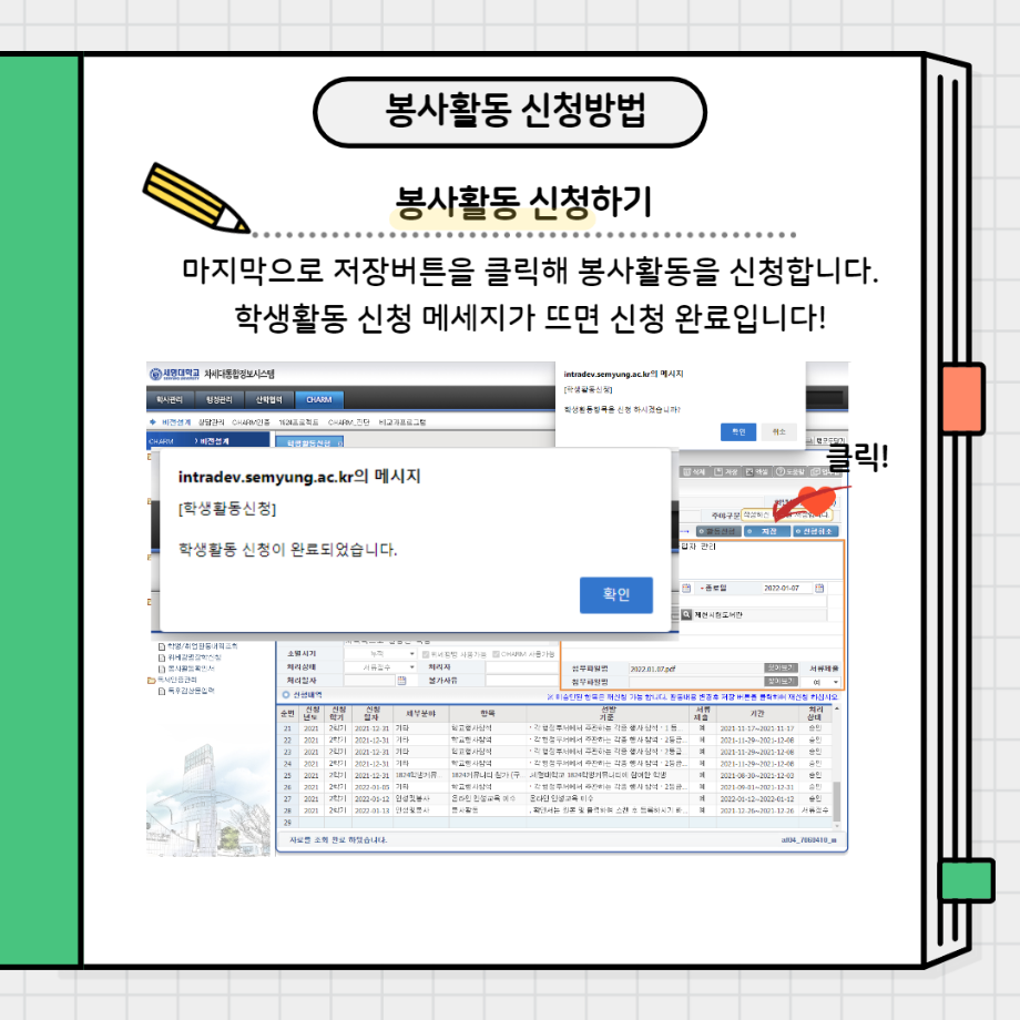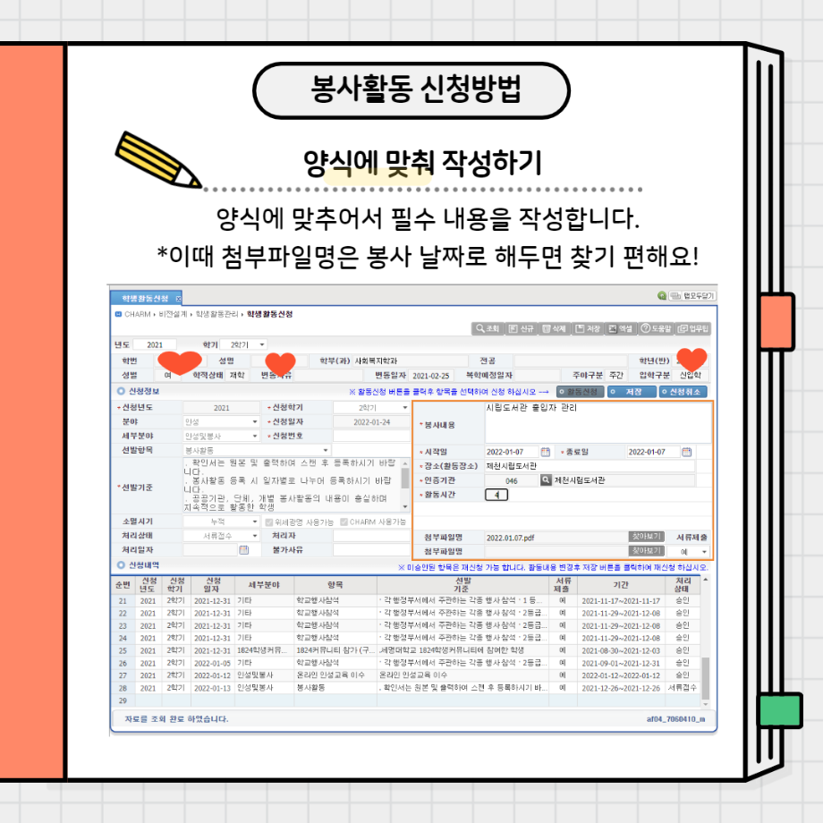 본문 시작 홈으로 커뮤니티 학과소개 교수소개 교육과정 현장실습 및 취업정보 커뮤니티 홈페이지가이드 학생 소통 광장 학과공지 학사일정 학생회 동아리 학생 소통 광장 포토갤러리 전공자료실 서식자료실 학생 소통 광장 페이스북 트위터 프린트 봉사활동 신청방법 사회복지학과 3094 2022-01-28 봉사활동 신청하는 방법입니다!! 봉사활동 많이 하고 미리 신청까지 해두세요~ 목록 이전사복과 선배님께 여쭤봐(4학년) 다음 사복과 선배님께 여쭤봐(2,3학년) 담당부서 : 사회복지학과 담당자 : - 연락처 : 043-649-1799 최종수정일 : 2024-10-26 만족도조사 만족도 조사 이 페이지에서 제공하는 정보에 대하여 만족하시나요? 매우만족 만족 보통 불만족 매우불만족