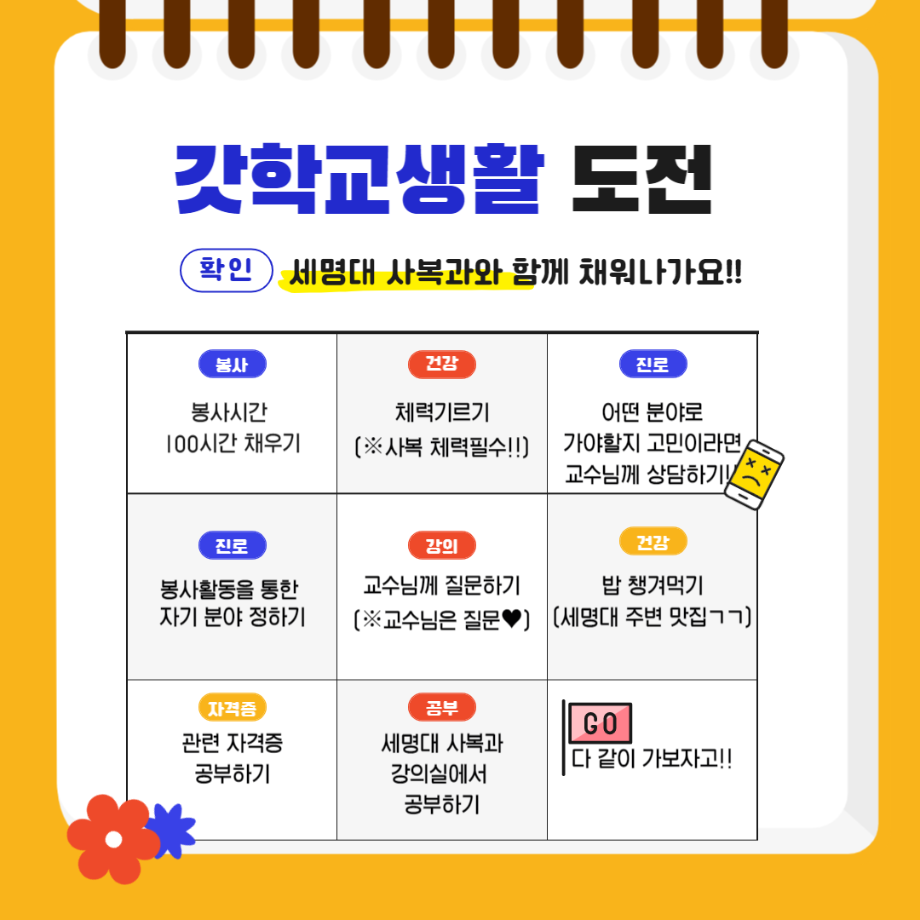 본문 시작 홈으로 커뮤니티 학과소개 교수소개 교육과정 현장실습 및 취업정보 커뮤니티 홈페이지가이드 학생 소통 광장 학과공지 학사일정 학생회 동아리 학생 소통 광장 포토갤러리 전공자료실 서식자료실 학생 소통 광장 페이스북 트위터 프린트 세명대학교사회복지학과 궁금한 학교생활 알아보기 빙고 사회복지학과 2703 2023-01-31 오늘은 세명대학교 사회복지학과 궁금한 학교생활 알아보기 빙고편입니다. 목록 이전정규형 교수님 교과목 소개 다음 세명대학교 사회복지학과 유용식 교수님 알아보기 편 담당부서 : 사회복지학과 담당자 : - 연락처 : 043-649-1799 최종수정일 : 2024-10-26 만족도조사 만족도 조사 이 페이지에서 제공하는 정보에 대하여 만족하시나요? 매우만족 만족 보통 불만족 매우불만족