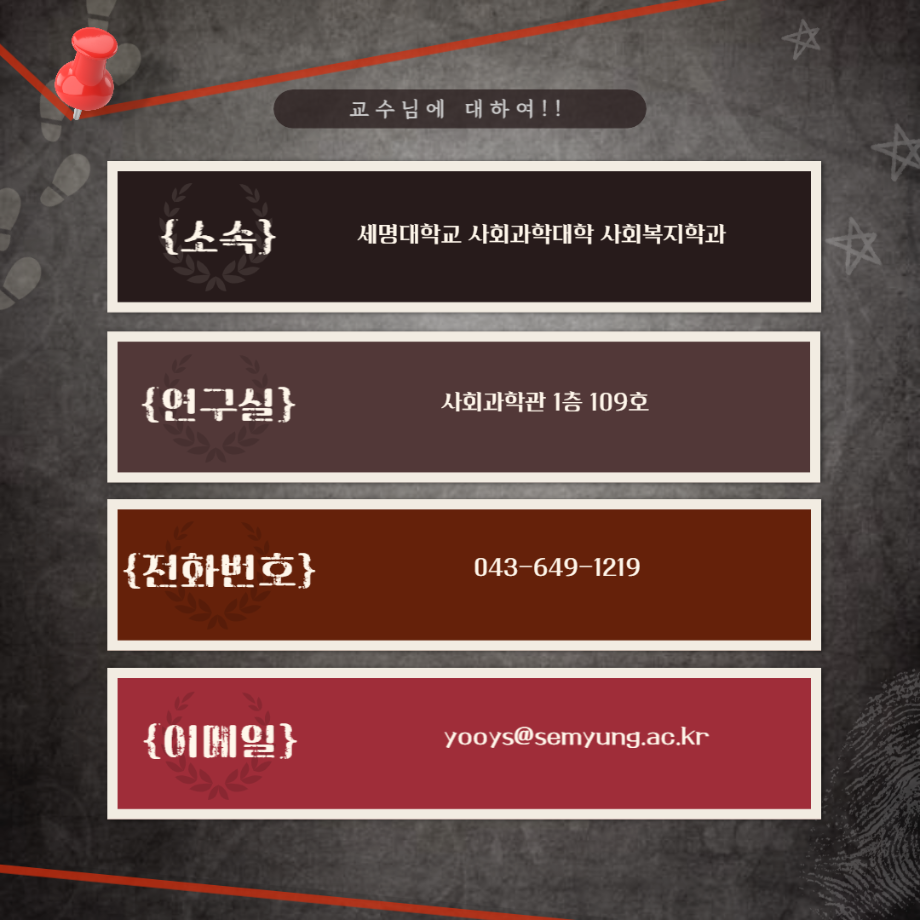 본문 시작 홈으로 커뮤니티 학과소개 교수소개 교육과정 현장실습 및 취업정보 커뮤니티 홈페이지가이드 학생 소통 광장 학과공지 학사일정 학생회 동아리 학생 소통 광장 포토갤러리 전공자료실 서식자료실 학생 소통 광장 페이스북 트위터 프린트 세명대학교 사회복지학과 유용식 교수님 알아보기 편 사회복지학과 2091 2023-02-06 '세명대학교 사회복지학과 유용식 교수님 알아보기 편' 입니다. 목록 이전세명대학교사회복지학과 궁금한 학교생활 알아보기 빙고 다음 세명대학교 사회복지학과 박소영 교수님 알아보기 편 담당부서 : 사회복지학과 담당자 : - 연락처 : 043-649-1799 최종수정일 : 2024-10-26 만족도조사 만족도 조사 이 페이지에서 제공하는 정보에 대하여 만족하시나요? 매우만족 만족 보통 불만족 매우불만족
