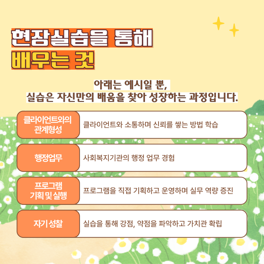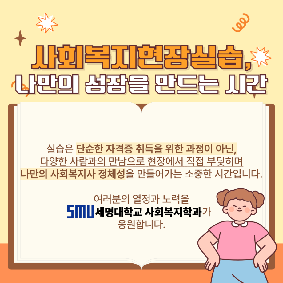 본문 시작 홈으로 커뮤니티 학과소개 교수소개 교육과정 현장실습 및 취업정보 커뮤니티 홈페이지가이드 학생 소통 광장 학과공지 학사일정 학생회 동아리 학생 소통 광장 포토갤러리 전공자료실 서식자료실 학생 소통 광장 페이스북 트위터 프린트 사회복지현장실습 알고 가자! 사회복지학과 1620 2025-08-04 오늘은 세명대학교 사회복지학과가 알려주는 '사회복지현장실습 알고 가자!' 편입니다. 목록 이전5월 8일은 어버이날입니다. 다음 사회복지현장실습 과정 안내 담당부서 : 사회복지학과 담당자 : - 연락처 : 043-649-1799 최종수정일 : 2024-10-26 만족도조사 만족도 조사 이 페이지에서 제공하는 정보에 대하여 만족하시나요? 매우만족 만족 보통 불만족 매우불만족