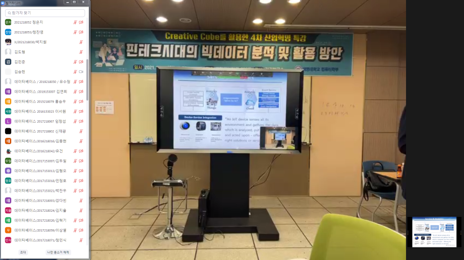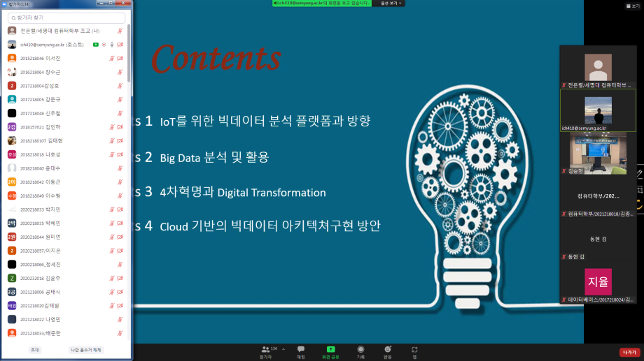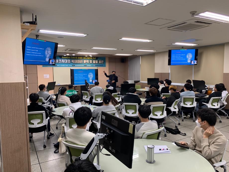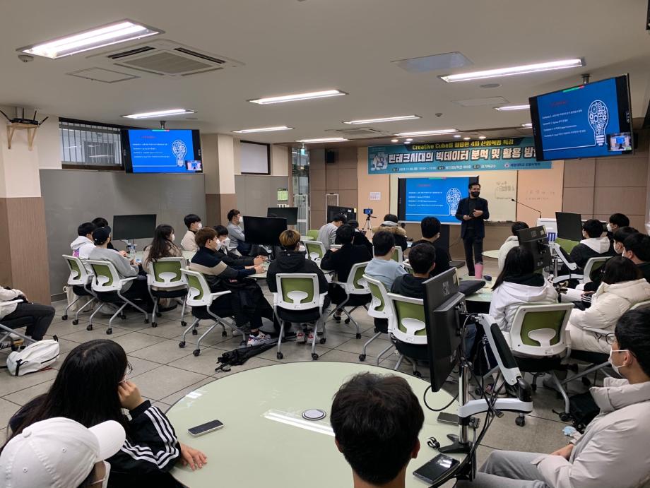 본문 시작 홈으로 학부활동 학부소개 학부활동 교육과정 커뮤니티 학부생활 입학안내 홈페이지가이드 학부갤러리 학부행사 학생회 활동 전공 동아리 학부갤러리 학부갤러리 페이스북 트위터 프린트 Creative Cube 를 활용한 4차 산업혁명 특강 컴퓨터학부 3557 2021-11-09 컴퓨터학부에서는 21.11.09(화) Creative Cube(첨단관 322호)에서 핀테크시대의 빅데이터 분석 및 활용 방안 - 교양대학 김기복 강사 의 주제로 Creative Cube 를 활용한 4차 산업혁명 특강을 진행하였습니다. 이번 특강은 대면특강 과 동시에 ZOOM을 활용한 실시간 송출을 진행하였으며 학부 학생 140명 가량이 참가하였고 성공적으로 마무리하였습니다. 목록 이전2021 한국컴퓨터종합학술대회 입상 다음 컴퓨터실무활용능력 자격증 특강 진행 담당부서 : 컴퓨터학부 담당자 : - 연락처 : 043-649-1272 최종수정일 : 2024-10-26 만족도조사 만족도 조사 이 페이지에서 제공하는 정보에 대하여 만족하시나요? 매우만족 만족 보통 불만족 매우불만족