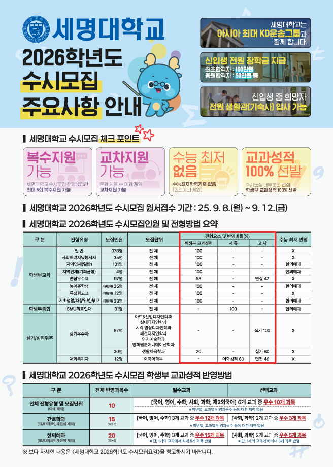 본문 시작 홈으로 학부활동 학부소개 학부활동 교육과정 커뮤니티 학부생활 입학안내 홈페이지가이드 학부갤러리 학부행사 학생회 활동 전공 동아리 학부갤러리 학부갤러리 페이스북 트위터 프린트 2026학년도 수시모집 주요사항 전체관리자 1370 2025-09-03 2026학년도 수시모집 주요사항 안내 목록 이전컴퓨터학부 소개 다음 컴퓨터학부 윈도우즈프로그래밍 전공 실습 담당부서 : 컴퓨터학부 담당자 : - 연락처 : 043-649-1272 최종수정일 : 2024-10-26 만족도조사 만족도 조사 이 페이지에서 제공하는 정보에 대하여 만족하시나요? 매우만족 만족 보통 불만족 매우불만족