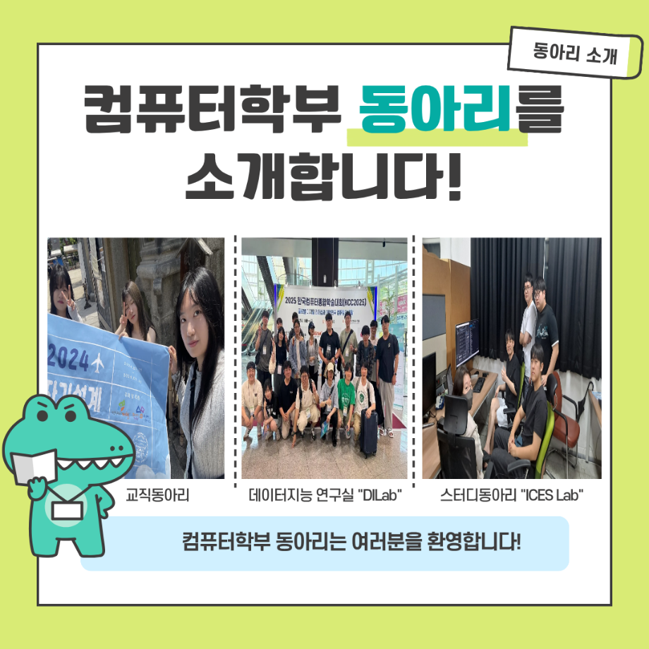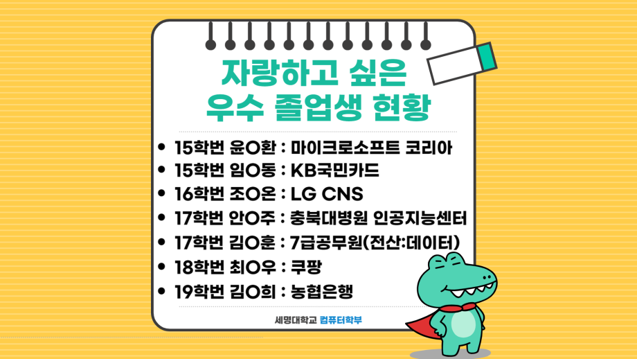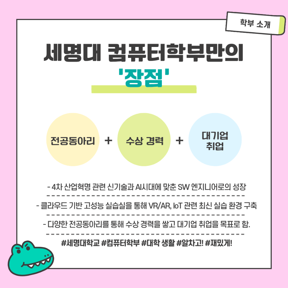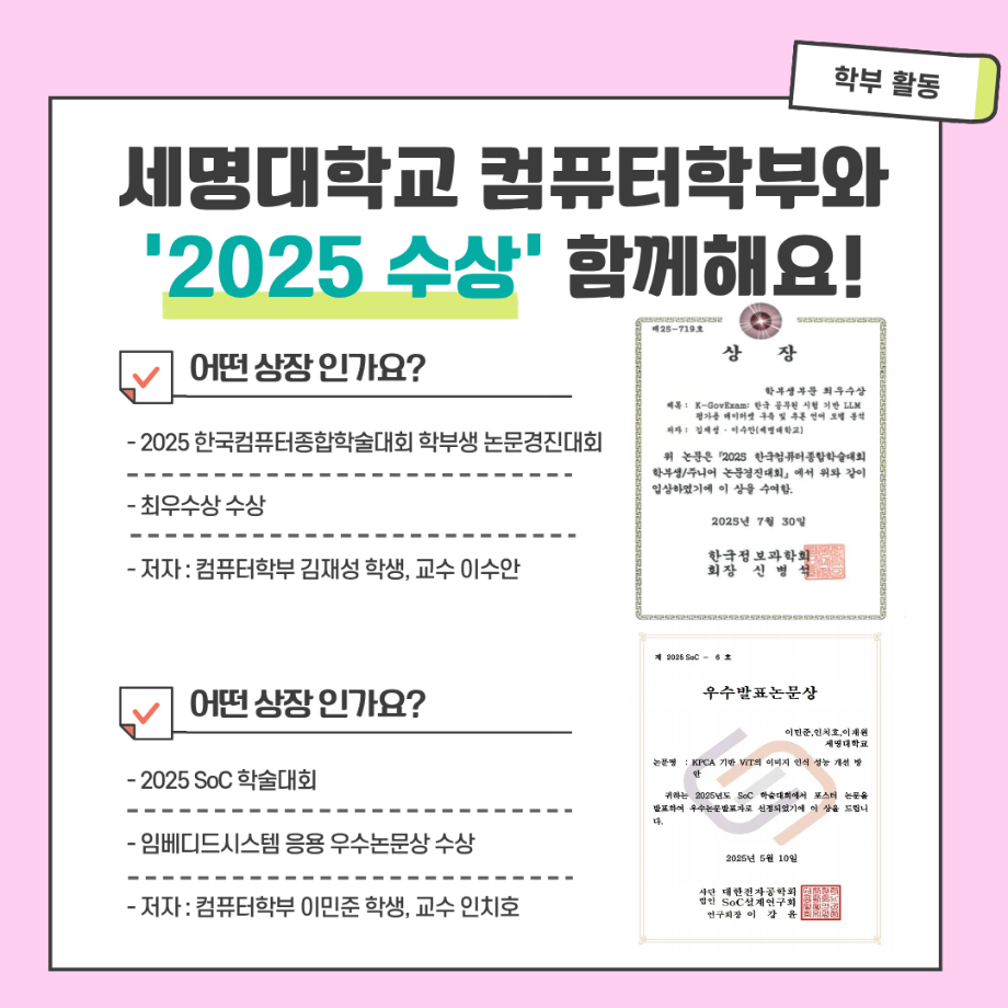본문 시작 홈으로 학부활동 학부소개 학부활동 교육과정 커뮤니티 학부생활 입학안내 홈페이지가이드 학부갤러리 학부행사 학생회 활동 전공 동아리 학부갤러리 학부갤러리 페이스북 트위터 프린트 컴퓨터학부 소개 전체관리자 1504 2025-09-01 세명대학교 컴퓨터학부 소개 목록 이전세명대 컴퓨터학부 송유정 교수, 제주 유광농장과 함께 제천에 따뜻한 나눔 전하다 다음 2026학년도 수시모집 주요사항 담당부서 : 컴퓨터학부 담당자 : - 연락처 : 043-649-1272 최종수정일 : 2024-10-26 만족도조사 만족도 조사 이 페이지에서 제공하는 정보에 대하여 만족하시나요? 매우만족 만족 보통 불만족 매우불만족