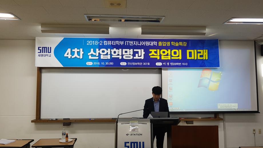 본문 시작 홈으로 학부활동 학부소개 학부활동 교육과정 커뮤니티 학부생활 입학안내 홈페이지가이드 학부갤러리 학부행사 학생회 활동 전공 동아리 학부갤러리 학부갤러리 페이스북 트위터 프린트 181030 IT단과대학 졸업생 취업특강 컴퓨터학부 7403 2018-10-30 전산 307호에서 컴퓨터학부 졸업생 전자부품연구원(KETI) 지능형영상처리센터 연구원 이경민(09학번, 2016년도 졸업) '4차 산업혁명과 직업의 미래' 라는 주제로 강의를 하였습니다. 목록 다음 181101 제1회 IT엔지니어링대학 학술발표대회 다음 181127 컴퓨터실무체험 교과목 취업특강 담당부서 : 컴퓨터학부 담당자 : - 연락처 : 043-649-1272 최종수정일 : 2024-10-26 만족도조사 만족도 조사 이 페이지에서 제공하는 정보에 대하여 만족하시나요? 매우만족 만족 보통 불만족 매우불만족