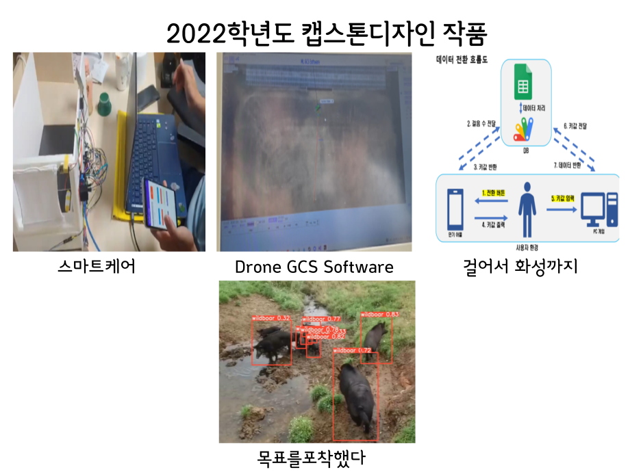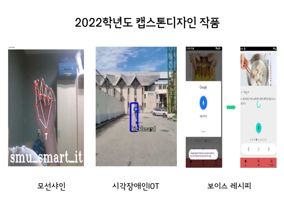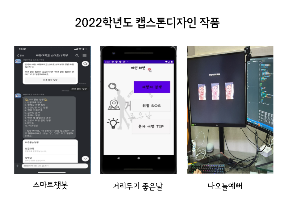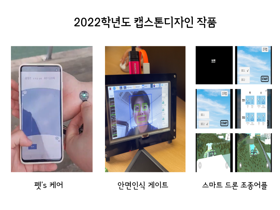본문 시작 홈으로 SMIT 소식 SMIT 소개 SMIT 교육 SMIT 취업 SMIT 소식 SMIT 입학 홈페이지가이드 경진대회 공지사항 갤러리 경진대회 동아리 경진대회 페이스북 트위터 프린트 2022학년도 캡스톤디자인 작품 스마트IT학부 2882 2022-06-02 2022년 06월 2일 스마트IT학부는 캡스톤디자인 경진대회를 학술관1층 로비에서 진행하였습니다. 4학년 재학생들이 4년동안 학습한 지식의 마무리 단계로서 1년 동안 준비한 작품을 교수님들께 설명과 함께 시연하고 교수님들의 평가 후 우수작품을 선정하여 학술관112호에서 시상하였습니다. 캡스톤디자인 결과발표회를 통해서 재학생들은 산업현장에서 진행해야 하는 프로젝트 업무를 간접적으로 느낄 수 있는 뜻 깊은 자리 였습니다. 목록 이전2021.06.10 제22회 캡스톤디자인 전시회 다음 2022 캡스톤디자인 장려상 모션사인 담당부서 : 스마트IT학부 담당자 : - 연락처 : 043-649-1275 최종수정일 : 2024-10-26 만족도조사 만족도 조사 이 페이지에서 제공하는 정보에 대하여 만족하시나요? 매우만족 만족 보통 불만족 매우불만족