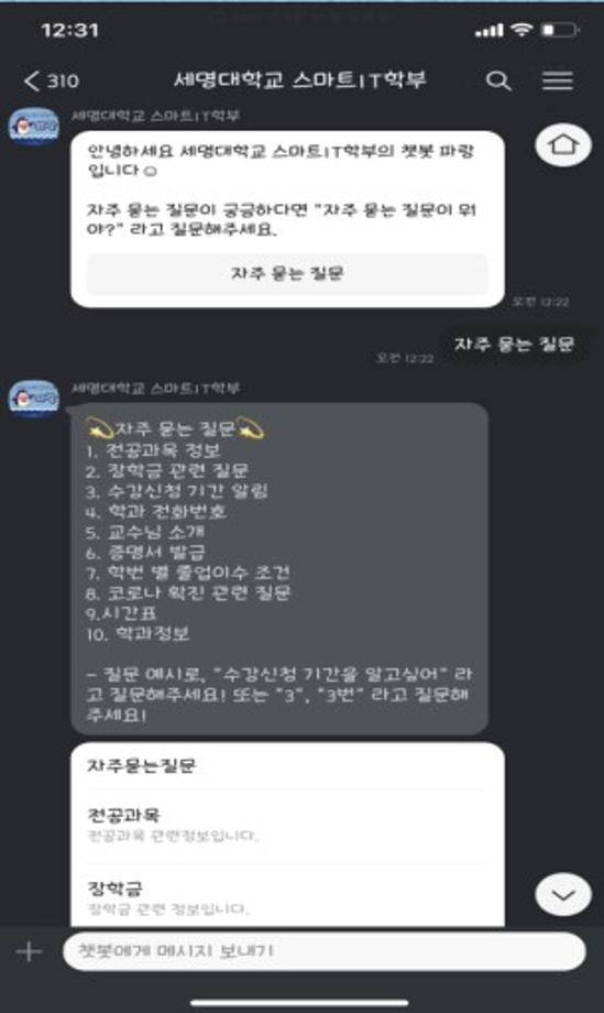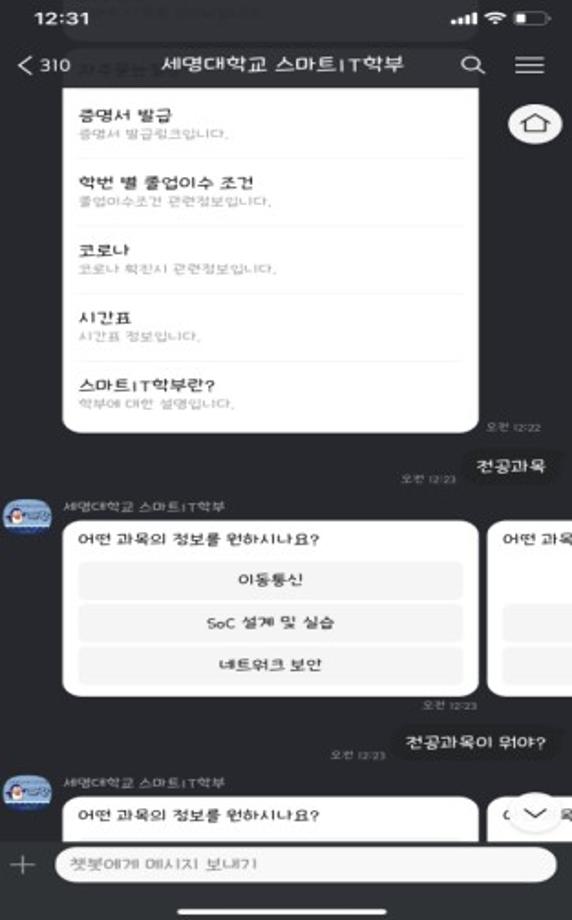 본문 시작 홈으로 SMIT 소식 SMIT 소개 SMIT 교육 SMIT 취업 SMIT 소식 SMIT 입학 홈페이지가이드 경진대회 공지사항 갤러리 경진대회 동아리 경진대회 페이스북 트위터 프린트 2022 캡스톤디자인 최우수상 스마트챗봇 스마트IT학부 8230 2022-06-02 최우수상 - 작품명 : 스마트챗봇 - 지도교수 : 송미화 - 팀원 : 김도연, 서황희, 황태현, 이영건 다수의 사용자들을 동시에 응대하는 다중처리성과 즉각 반응하는 실시간성 등 여러 장점을 갖춘 챗봇을 대다수의 학부생들이 이용하고 있고, 간단하게 접근 가능한 카카오톡에 연동시켜 개발하였다. 목록 이전2022 캡스톤디자인 우수상 Drone GCS Software 다음 멀티모달 기반 인공감성지능 모델 개발 담당부서 : 스마트IT학부 담당자 : - 연락처 : 043-649-1275 최종수정일 : 2024-10-26 만족도조사 만족도 조사 이 페이지에서 제공하는 정보에 대하여 만족하시나요? 매우만족 만족 보통 불만족 매우불만족