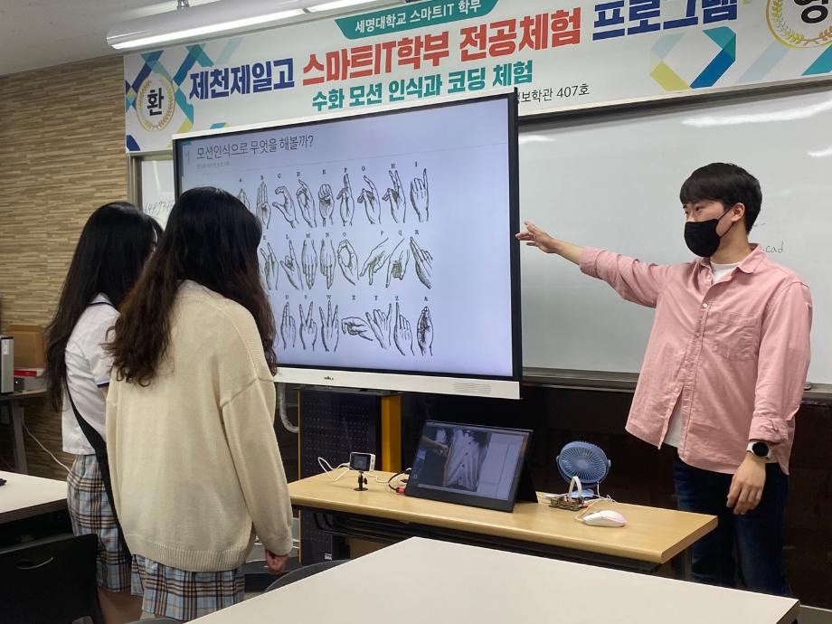 스마트IT학부는 2022.05.06 (금) 오전10시부터 오전 11시 30분 까지 첨단정보학관 407호에서 제천제일고 3학년 재학생을 대상으로 전공체험 프로그램을 시행하였다.