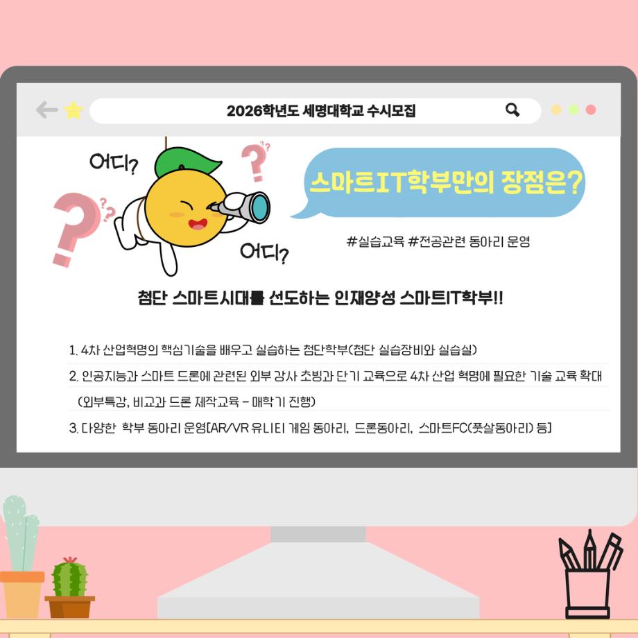 본문 시작 홈으로 SMIT 소식 SMIT 소개 SMIT 교육 SMIT 취업 SMIT 소식 SMIT 입학 홈페이지가이드 갤러리 공지사항 갤러리 경진대회 동아리 갤러리 페이스북 트위터 프린트 ◈ 스마트IT학부의 모든것🎶 ◈ 스마트IT학부 1722 2025-08-12 📢 스마트IT학부의 모든것!! - 내가알려줄게 🎉🎉 #세명대학교 #스마트IT학부 #드론 #카드뉴스 목록 이전2025 스마트IT학부 일보 다음 2024-후기 대학원 박사 학위수여식 담당부서 : 스마트IT학부 담당자 : - 연락처 : 043-649-1275 최종수정일 : 2024-10-26 만족도조사 만족도 조사 이 페이지에서 제공하는 정보에 대하여 만족하시나요? 매우만족 만족 보통 불만족 매우불만족