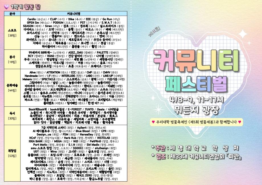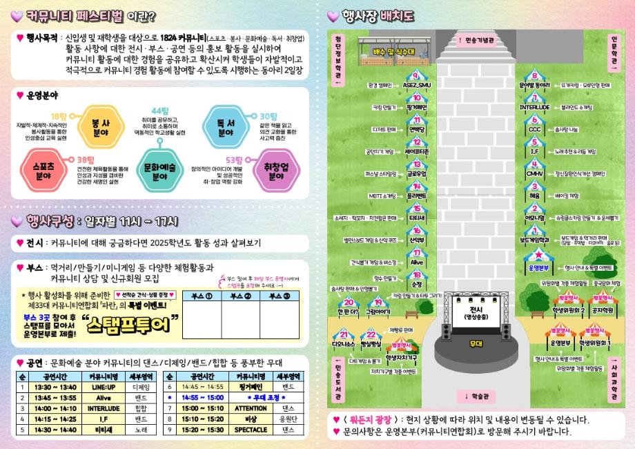 본문 시작 홈으로 SMIT 소식 SMIT 소개 SMIT 교육 SMIT 취업 SMIT 소식 SMIT 입학 홈페이지가이드 갤러리 공지사항 갤러리 경진대회 동아리 갤러리 페이스북 트위터 프린트 🎪 <제11회 커뮤니티 페스티벌> 시행 안내 🎪 스마트IT학부 34 2026-04-06 🎪 <제11회 커뮤니티 페스티벌> 시행 안내 🎪 목록 이전AI융합대학으로 명칭 변경! 다음 제 5회 세명대학교 벚꽃축제 '벚꽃세봄' 개최 안내 담당부서 : 스마트IT학부 담당자 : - 연락처 : 043-649-1275 최종수정일 : 2024-10-26 만족도조사 만족도 조사 이 페이지에서 제공하는 정보에 대하여 만족하시나요? 매우만족 만족 보통 불만족 매우불만족