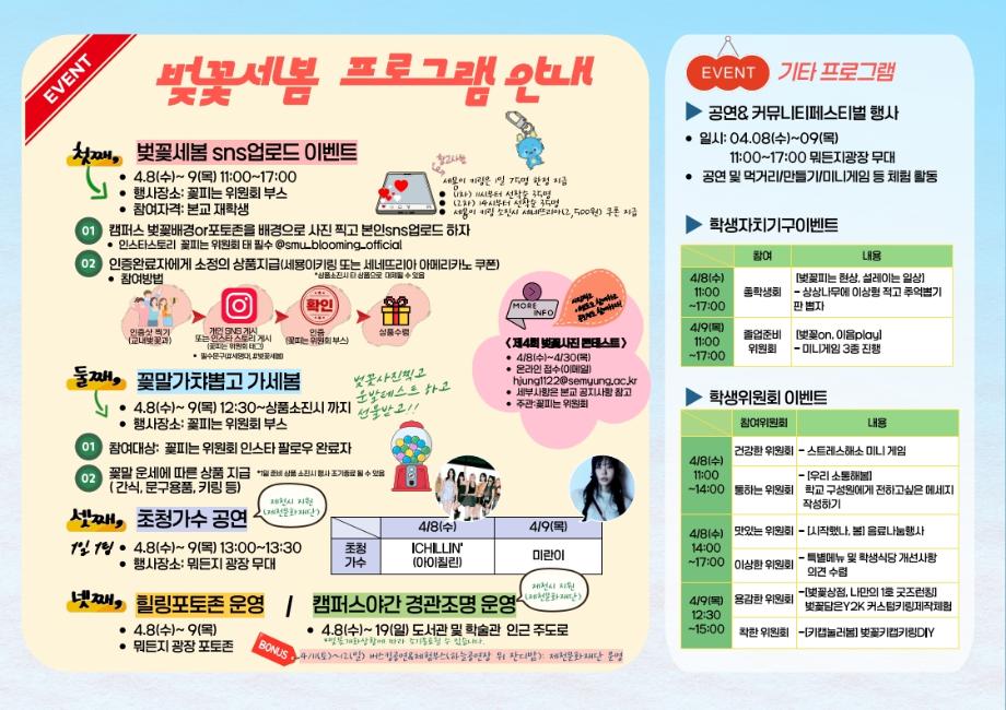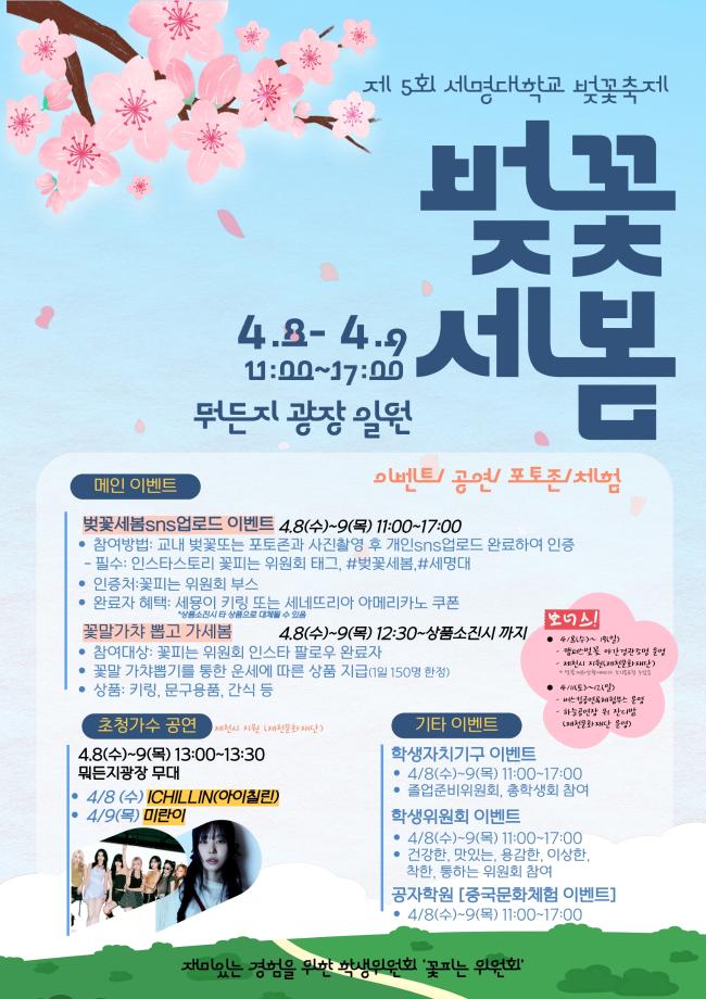 본문 시작 홈으로 SMIT 소식 SMIT 소개 SMIT 교육 SMIT 취업 SMIT 소식 SMIT 입학 홈페이지가이드 갤러리 공지사항 갤러리 경진대회 동아리 갤러리 페이스북 트위터 프린트 제 5회 세명대학교 벚꽃축제 '벚꽃세봄' 개최 안내 스마트IT학부 37 2026-04-06 제 5회 세명대학교 벚꽃축제 '벚꽃세봄' 개최 안내 목록 이전🎪 <제11회 커뮤니티 페스티벌> 시행 안내 🎪 담당부서 : 스마트IT학부 담당자 : - 연락처 : 043-649-1275 최종수정일 : 2024-10-26 만족도조사 만족도 조사 이 페이지에서 제공하는 정보에 대하여 만족하시나요? 매우만족 만족 보통 불만족 매우불만족