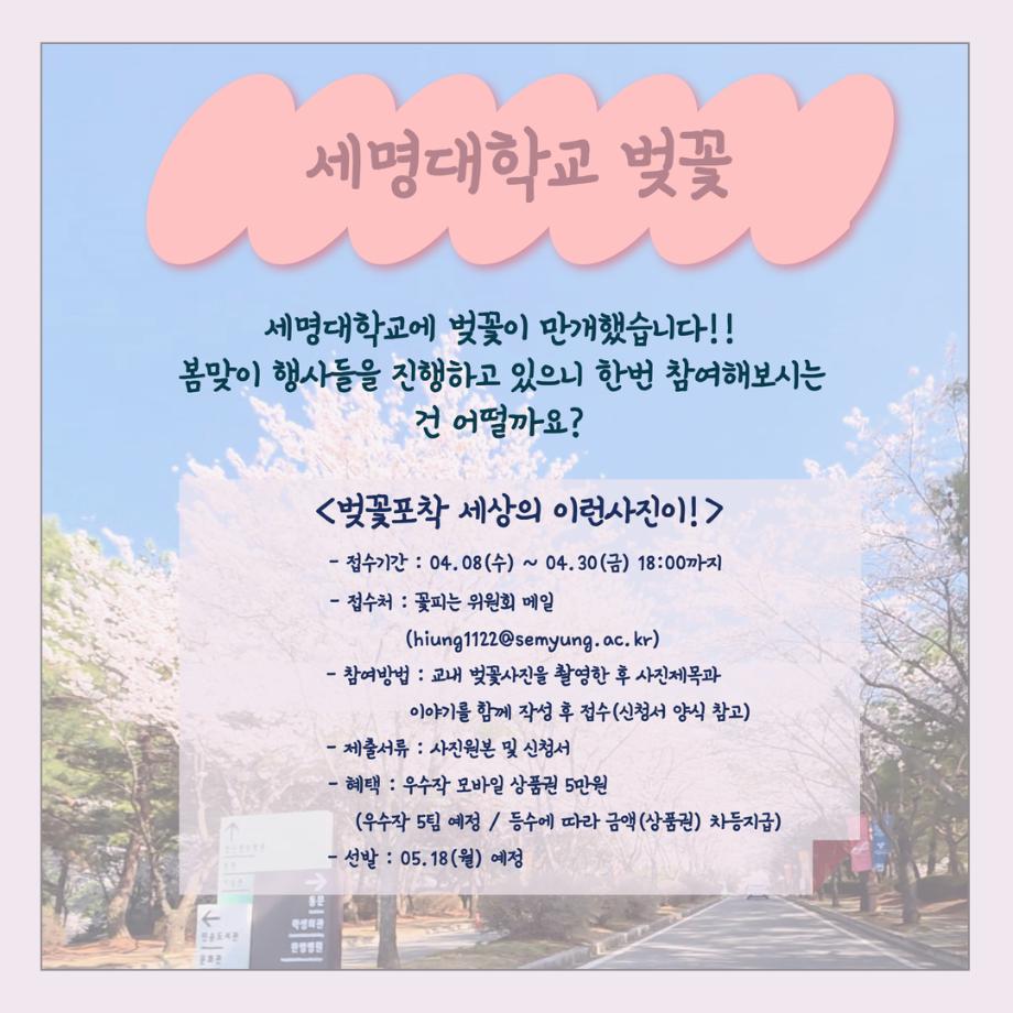 본문 시작 홈으로 SMIT 소식 SMIT 소개 SMIT 교육 SMIT 취업 SMIT 소식 SMIT 입학 홈페이지가이드 갤러리 공지사항 갤러리 경진대회 동아리 갤러리 페이스북 트위터 프린트 세명대알림_4월(2) : 세명대학교 벚꽃 스마트IT학부 39 2026-04-14 세명대알림_4월(2) : 세명대학교 벚꽃 목록 이전세명대알림_4월(1) : 2026학년도 1학기 중간고사 다음 스마트IT알림_4월 : 스마트IT학부 졸업요건 담당부서 : 스마트IT학부 담당자 : - 연락처 : 043-649-1275 최종수정일 : 2024-10-26 만족도조사 만족도 조사 이 페이지에서 제공하는 정보에 대하여 만족하시나요? 매우만족 만족 보통 불만족 매우불만족